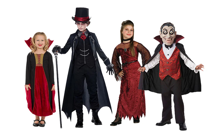 Blood-sucking vampires of the night disguise themselves as humans but sneakily feast on the blood of unsuspecting victims from the shadows. Their creepy persona and distinct appearance of pale white skin, a popped-up collar cape and sharp fangs have been the basis of movies and myths for generations and everyone is familiar with the character. This one is a kids Halloween costume classic!
