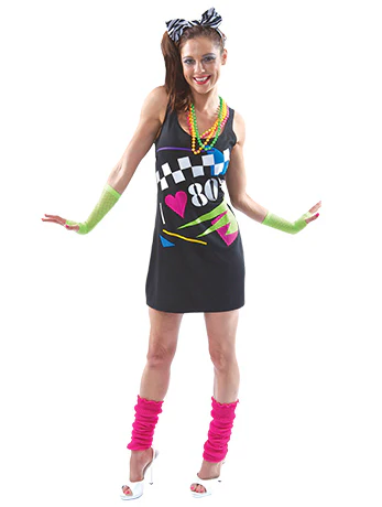 For a cheap 80s fancy dress idea that’s very cheerful, the I love the 80s dress is standard! Wear this one either alone or paired up with a tutu and leg warmers for added 80s vibes. It’s a bargain at just £11.99, and has that pop of colour you need!