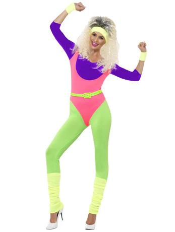 Another 80s fashion trend that was (when looking back) outrageous that it even happened – the work out gear! Everyone was jumping onto the fitness bandwagon, but this time in skimpy Lycra leotards, leggings and sweatbands. Just be careful to stay covered up when daring to bare all in these outfits… you can really give an eyeful! Below is our neon leotard costume and Mr Motivator inspired outfit!