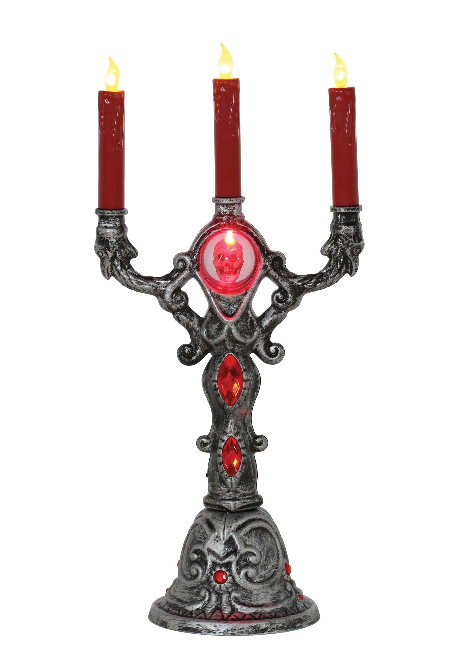 Set the scene with a 17.5 Inch LED Candelabra Prop! The molded candelabra features intricate details on its base and arms. It's painted to look like antique silver and is set with red plastic "gems" as well as a red skull decoration. Three red candles with LED "flames" are included.