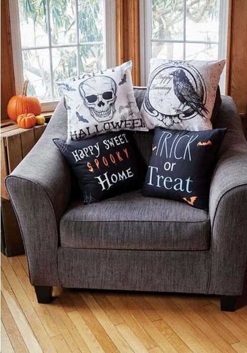 Give your home a marvelously macabre flair with this 18 Inch Happy Halloween Skull Pillow Cover! The beige pillow cover is decorated with distressed details. A printed skull is printed in the center, framed by the words "Happy Halloween." Bat graphics flit around the skull.