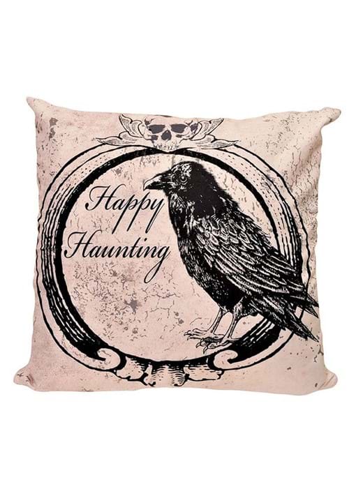 Make your holiday scary fun by decorating with an 18 Inch Happy Haunting Raven Pillow Cover! The beige cloth pillowcase is printed with weathering details. A large image of a somber raven standing inside a skull-topped frame stares out at the viewer. The words "Happy Haunting" are printed next to the bird.