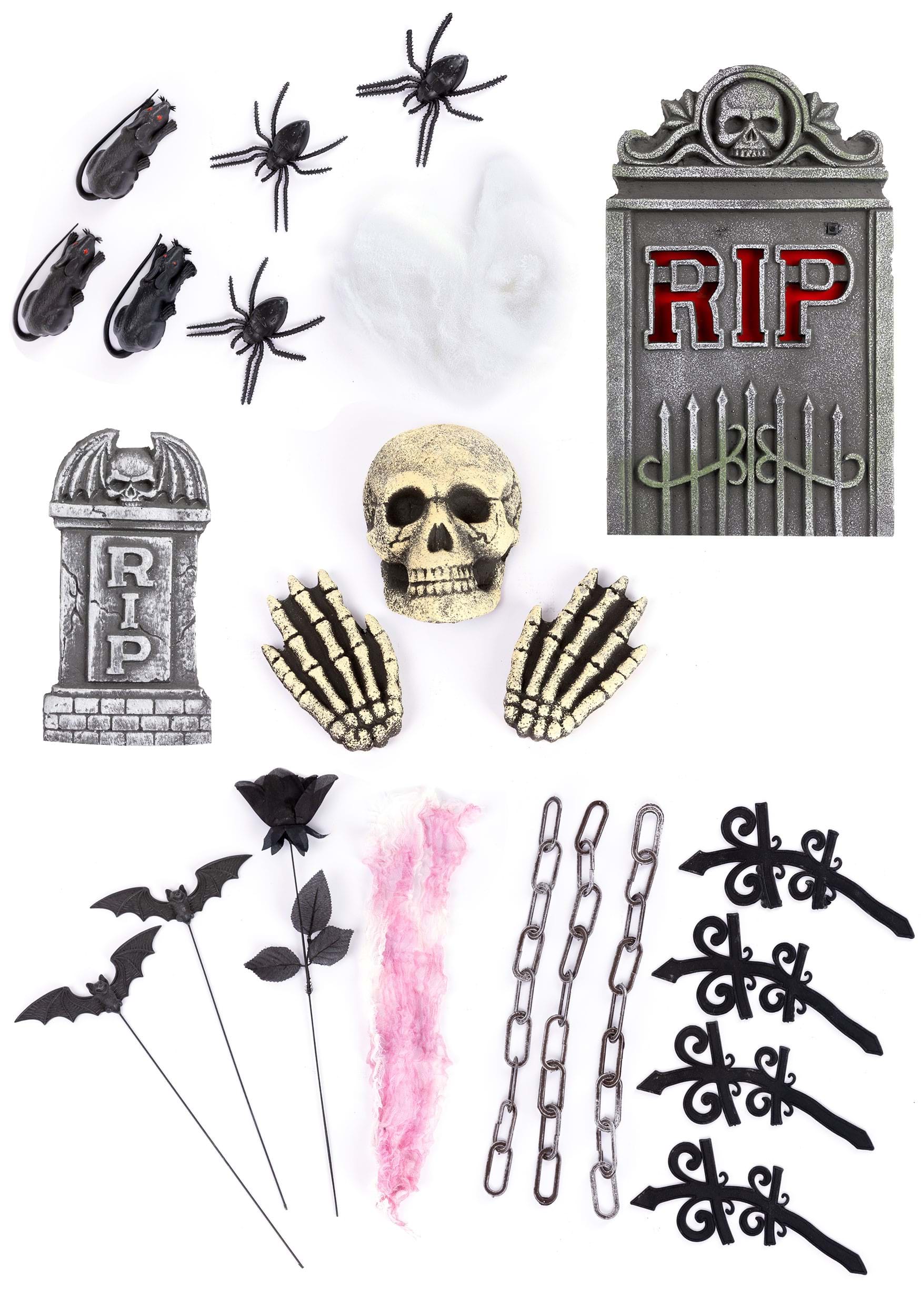 Craft the creepiest of cemeteries! Our set has everything from styrofoam outdoor tombstones and bones to creepy crawlies like spiders and rats. The grand skull tombstone towers at 22", even lighting up (batteries not included) for that added ghostly glow. Accompanying it are two smaller tombstones, standing 11" tall. Arrange the 6" foam skull and hands emerging from the ground and connect the eerie fence posts with chains.