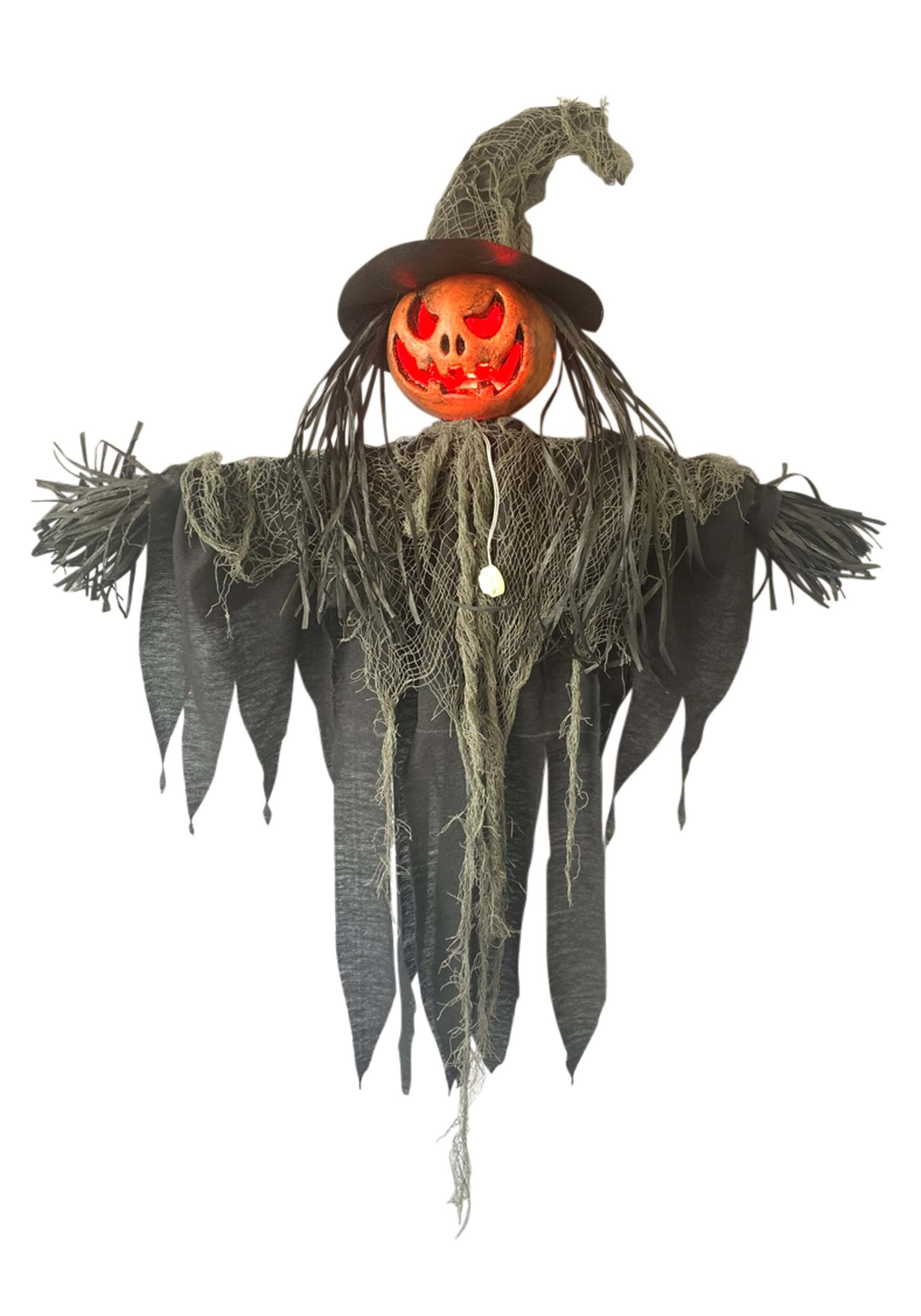 This pumpkin witch is ready to haunt your front yard. It can hang from your porch, a tree, or even on a shepherd's hook. Running on batteries, there's no need to plug it in so that you can place this wherever looks best. The pumpkin's head has a vicious smile and glows from the interior like a real jack-o-lantern. Draping fabric layered with earth-toned gauze will blow in the eerie autumn wind. Shaggy hair flies out from under the witch's hat, making this character look wicked and ready for some Halloween fun!