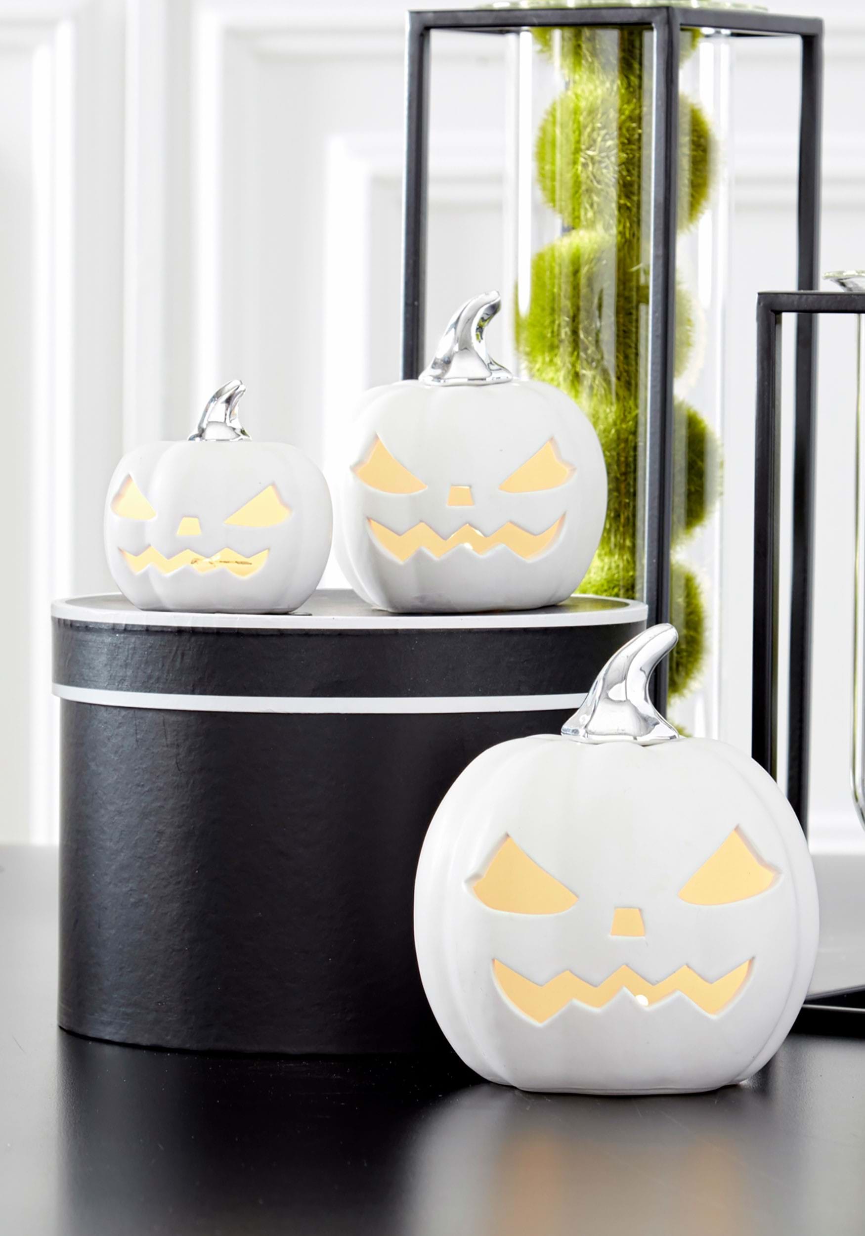 This white ceramic jack-o-lantern has a clean white look and has a silver stem. Running on batteries, the pumpkin glows with an LED light that will sparkle throughout your Halloween season. With a happy, carved smile, it'll add a cheery touch to any spooky display!