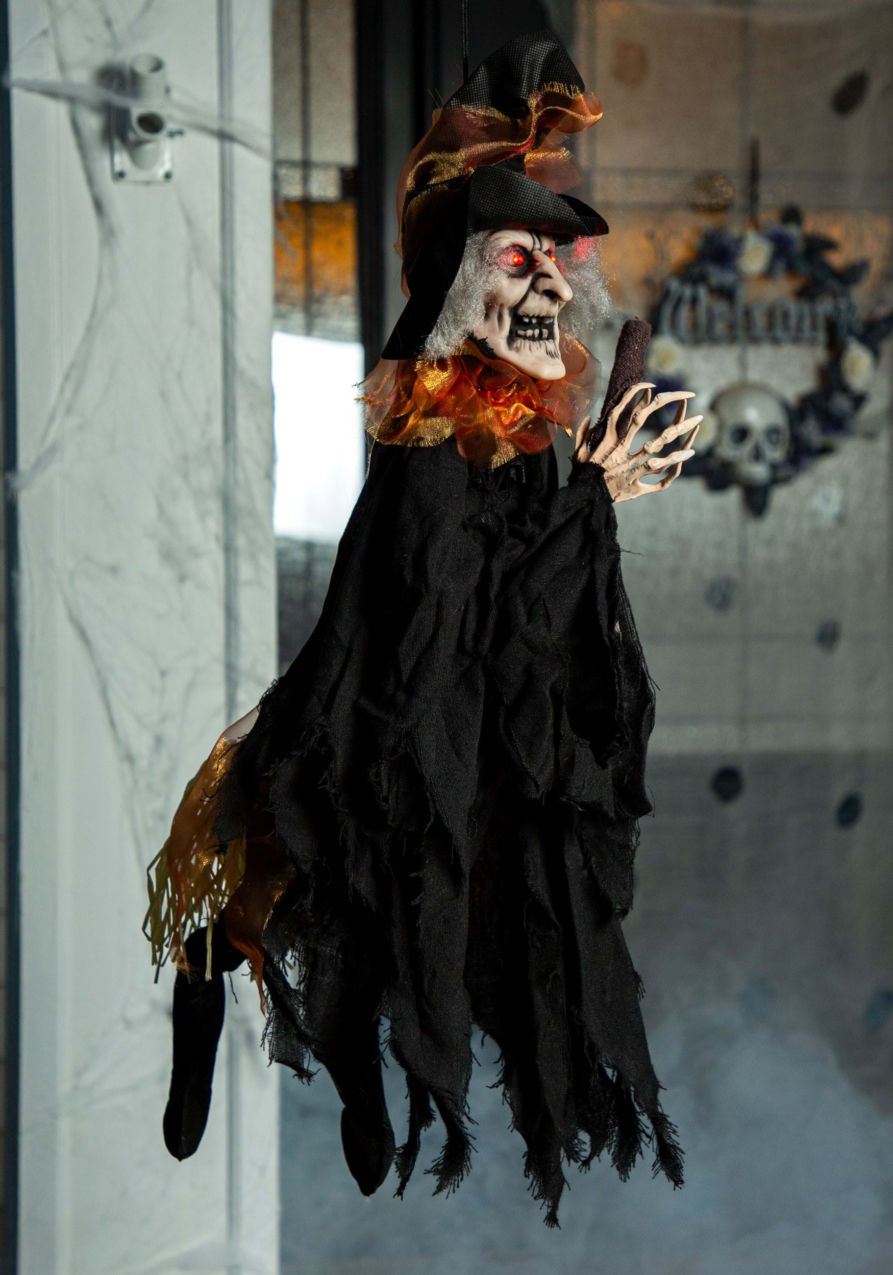 Serve up chills and laughter this Halloweenb with an exclusive 3 Foot Animated Kicking Witch Decoration! This feisty magic-maker has a wizened face with glowing red eyes under a pointed black hat. Her black robes are embellished with gauzy orange ribbon and her claw-like hands wrap around her trusty broomstick. She comes programmed with a variety of Halloween-themed sayings that are sure to delight any visitor - as long as they don't get too close!