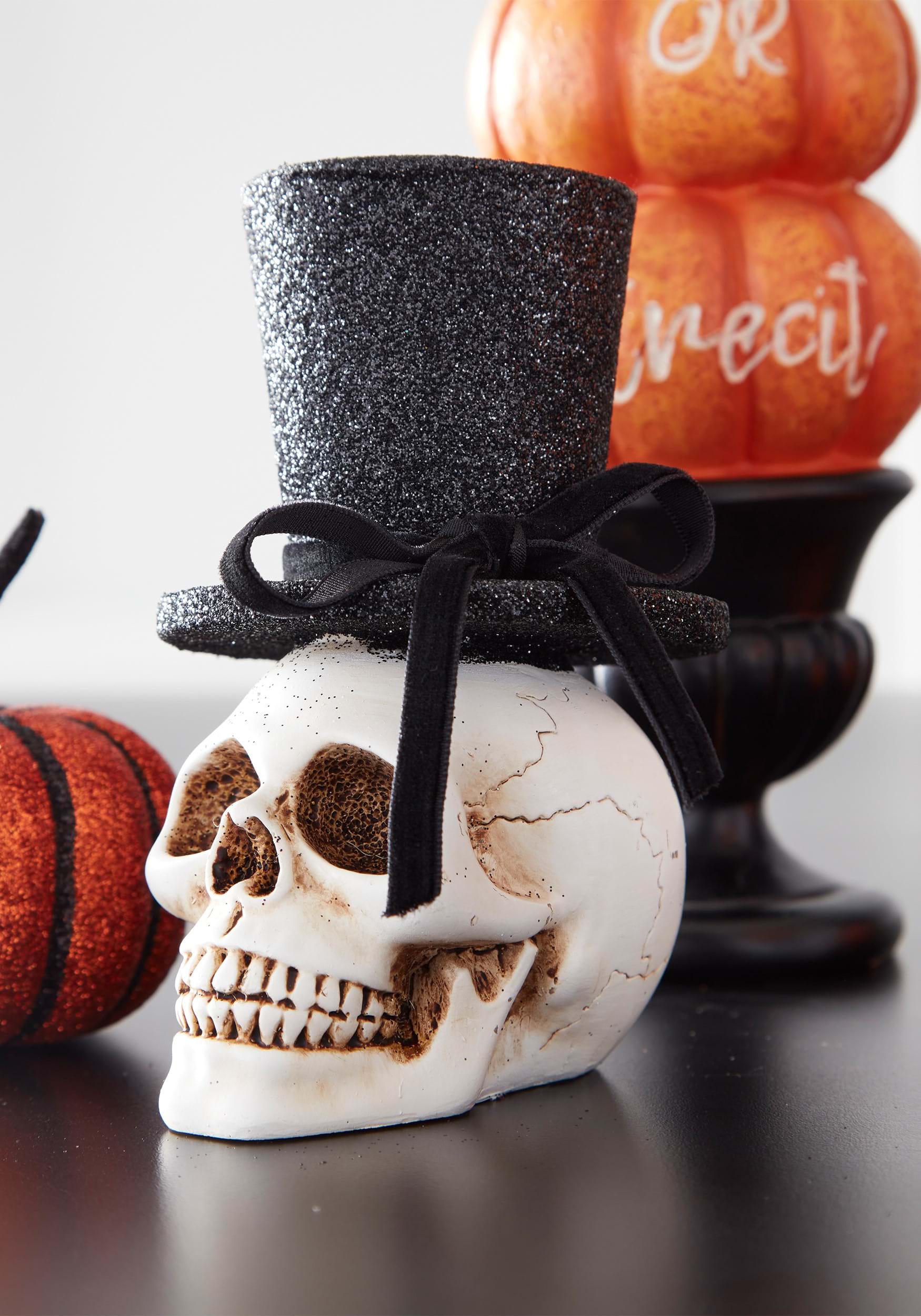 This is a 5" Resin Skull with Glittery Black Top Hat.
