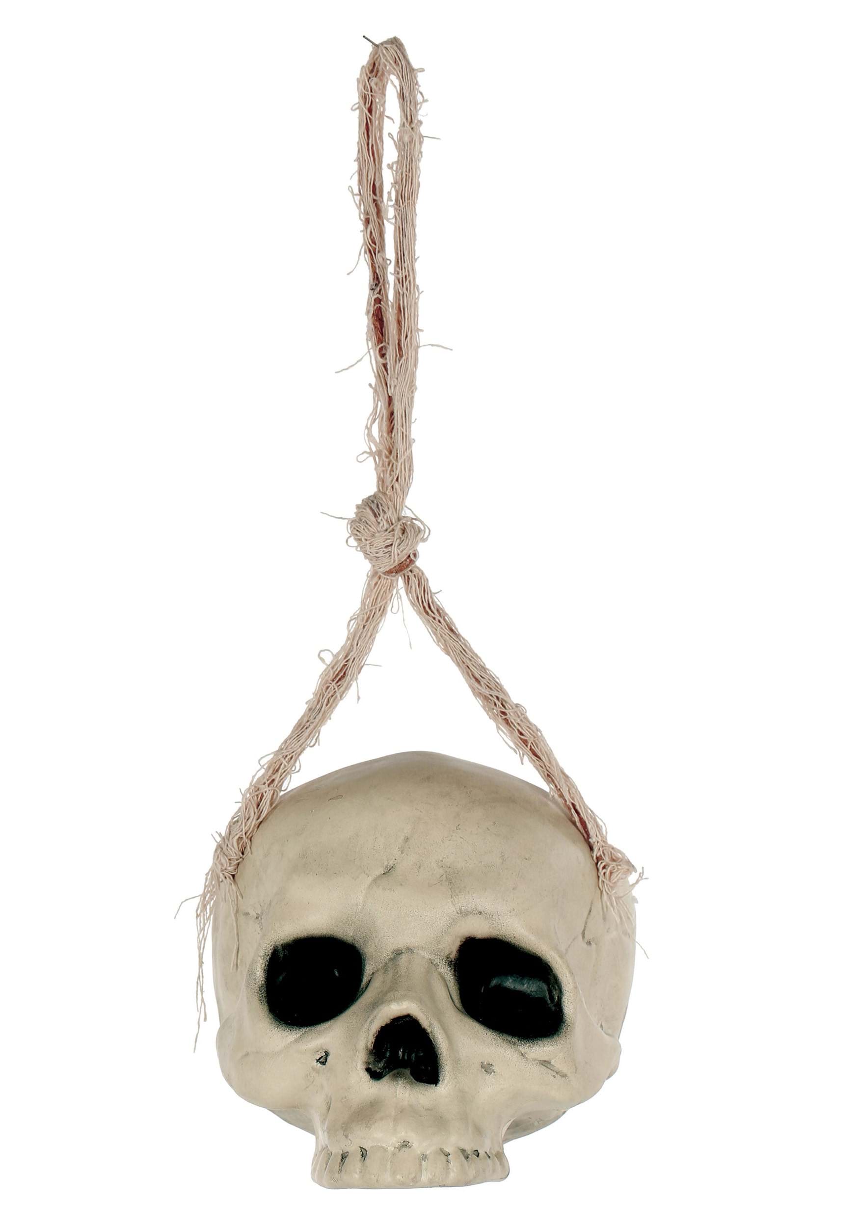 Frighten your visitors with this 6 Inch Hanging Skull! The molded plastic prop is designed to look like a human skull without a bottom jaw. A rustic cord loop is attached so that you can hang it as desired.