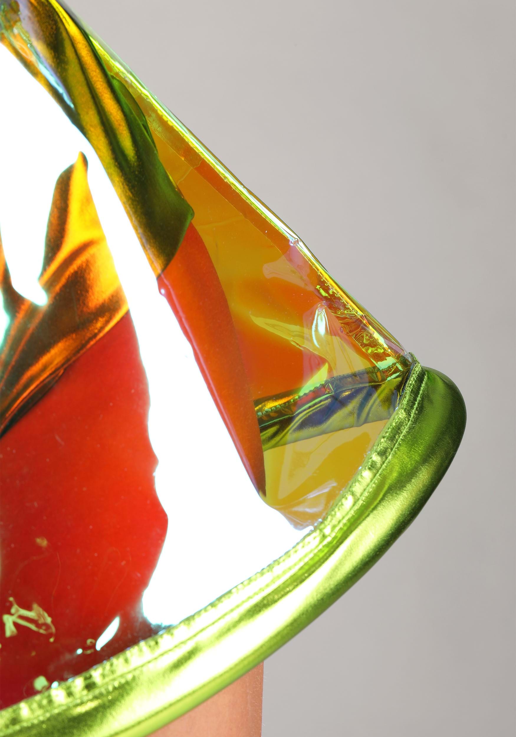 - Iridescent vinyl skirt has green metallic lame fabric waistband with hook and loop fastener on the side, green metallic lame fabric covered foam hemline