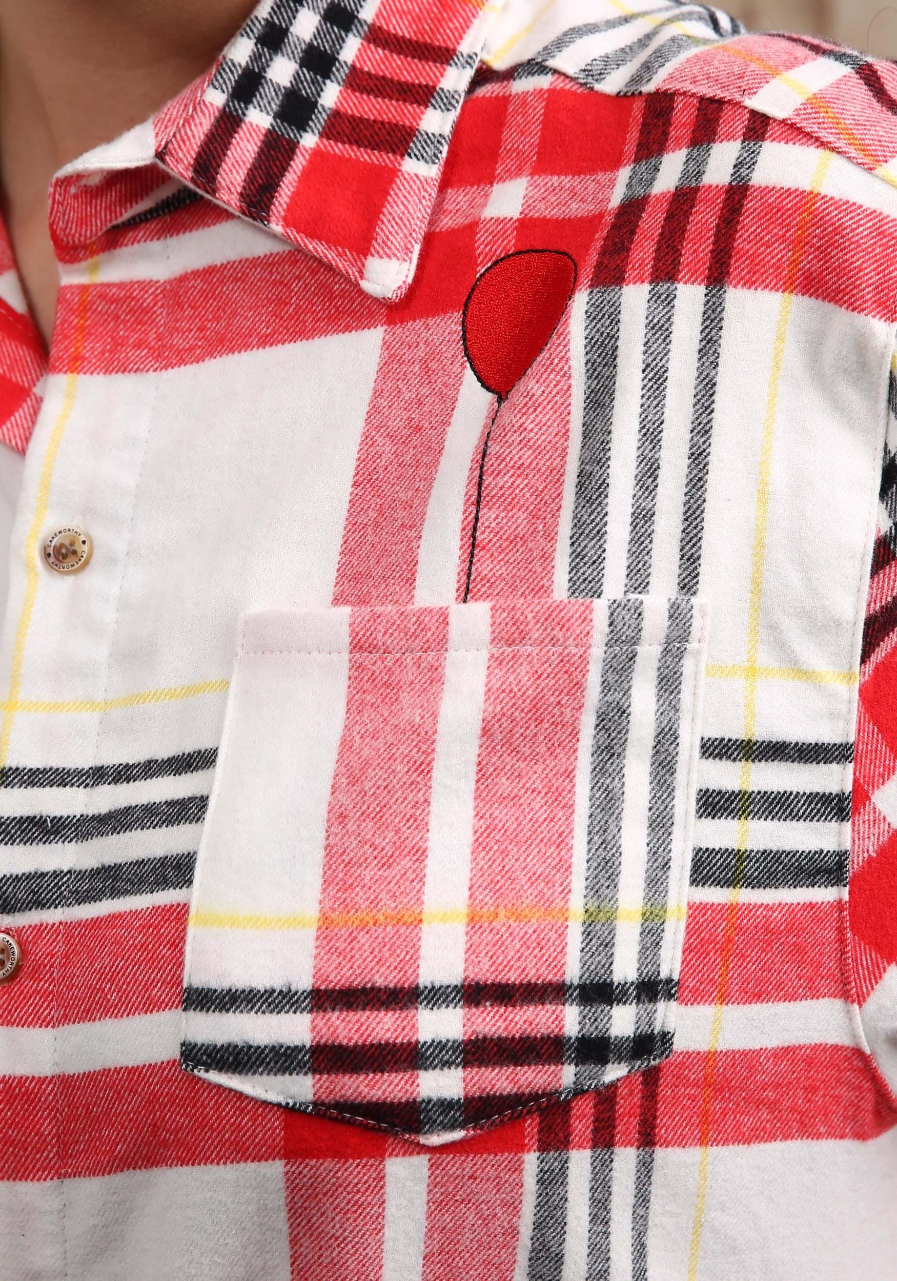 Crafted entirely from soft, breathable 100% cotton, comfort meets horror in this adult Cakeworthy IT Long Sleeve Flannel. The shirt features intricate embroidered details on the chest pocket—a subtle nod to the master of scares. A convenient button-down at the center front ensures a sleek look, while the back boasts haunting printed details that scream Pennywise.