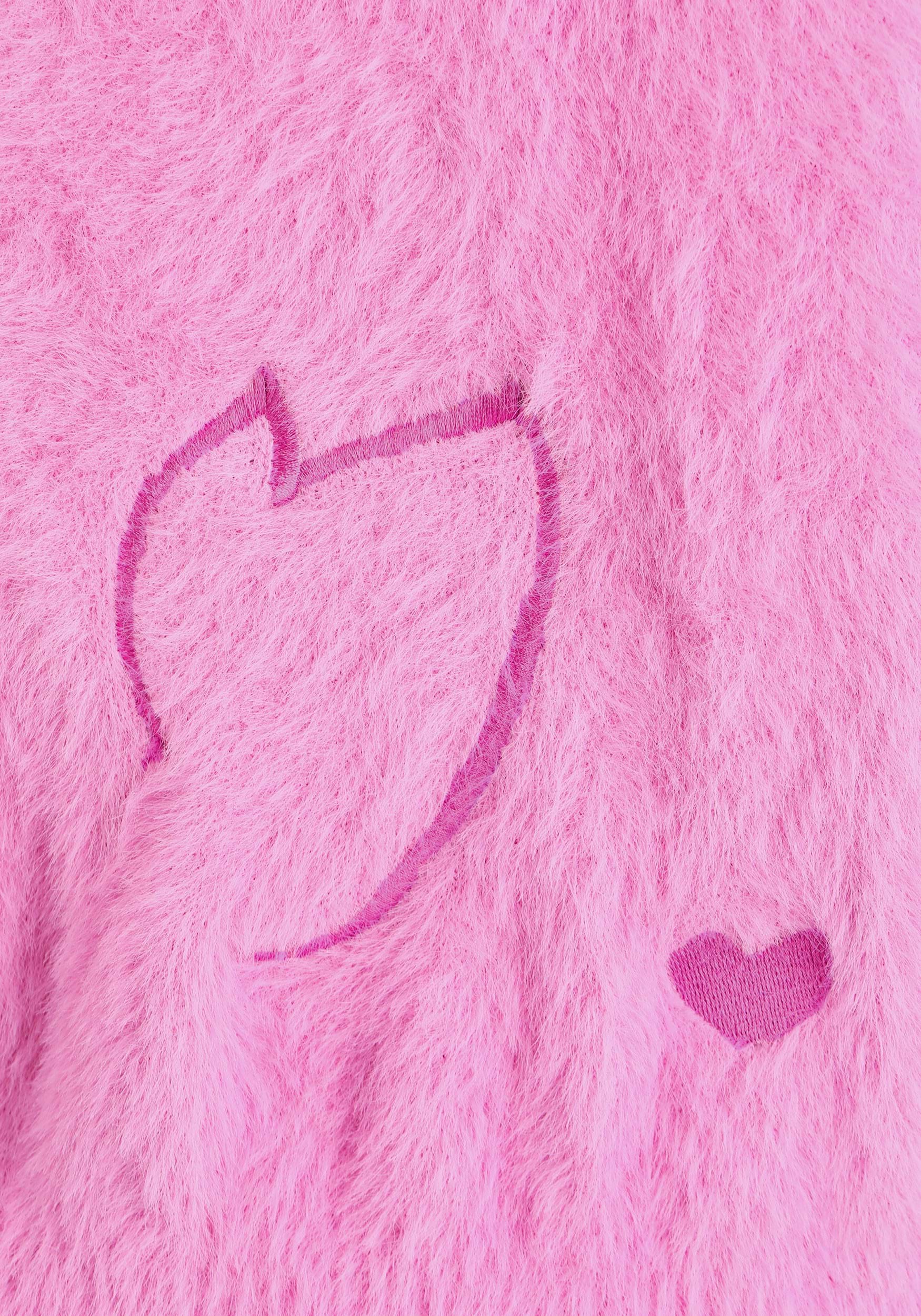 - Soft, faux fur sweater has a fleece fabric belly, embroidered rainbow
