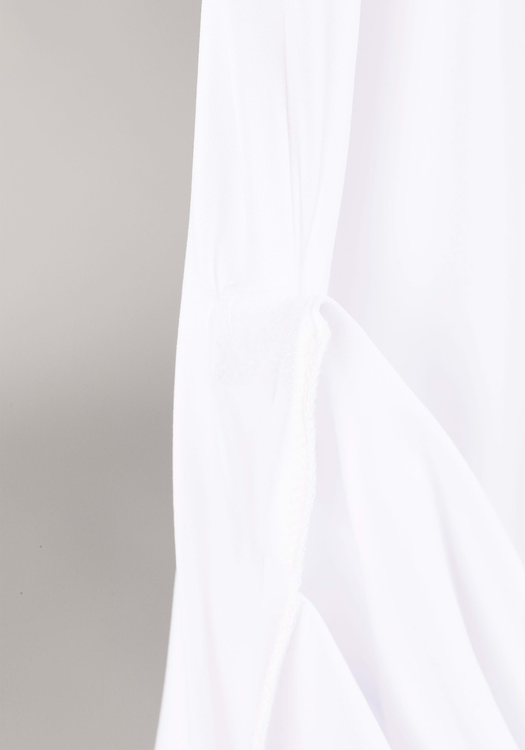 - Front drape attaches to dress at left shoulder and right hip with hook & loop fastener