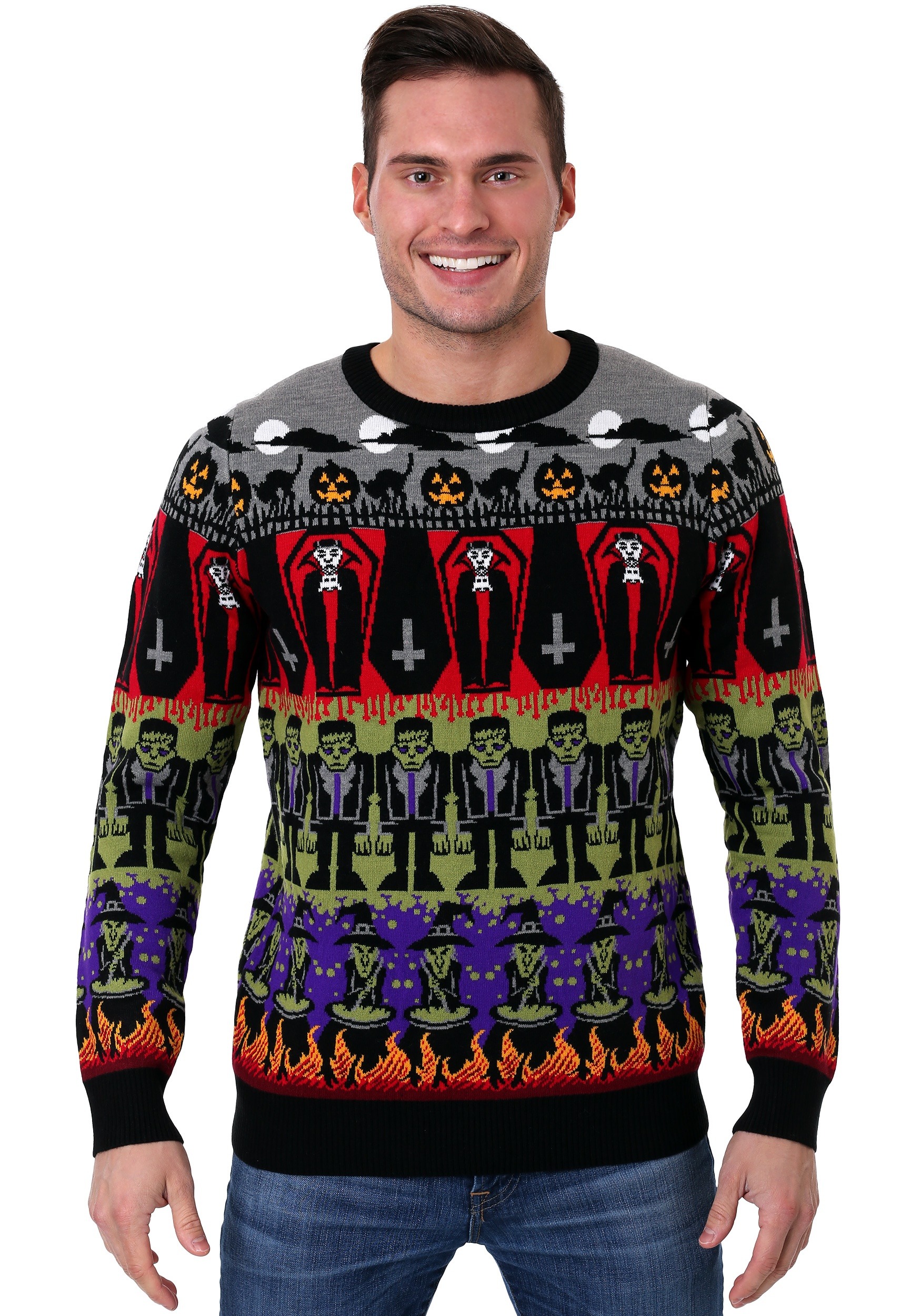 Introducing, the exclusive horror monsters Halloween sweater. Featuring a colorful, traditional Fair Isle pattern, the Made By Us pullover is knitted from 12-gauge yarn to create intricate details with rib knit sleeve cuffs and waistband, creating a more fitting look for both women and men. Displaying knitted-in images of vampires in caskets, black cats next to pumpkins, cauldron-stirring witches and a row of repeated Frankensteins, the pullover sweater is a necessity for anyone who wants to encompass all the classic monsters with one stylish look.
