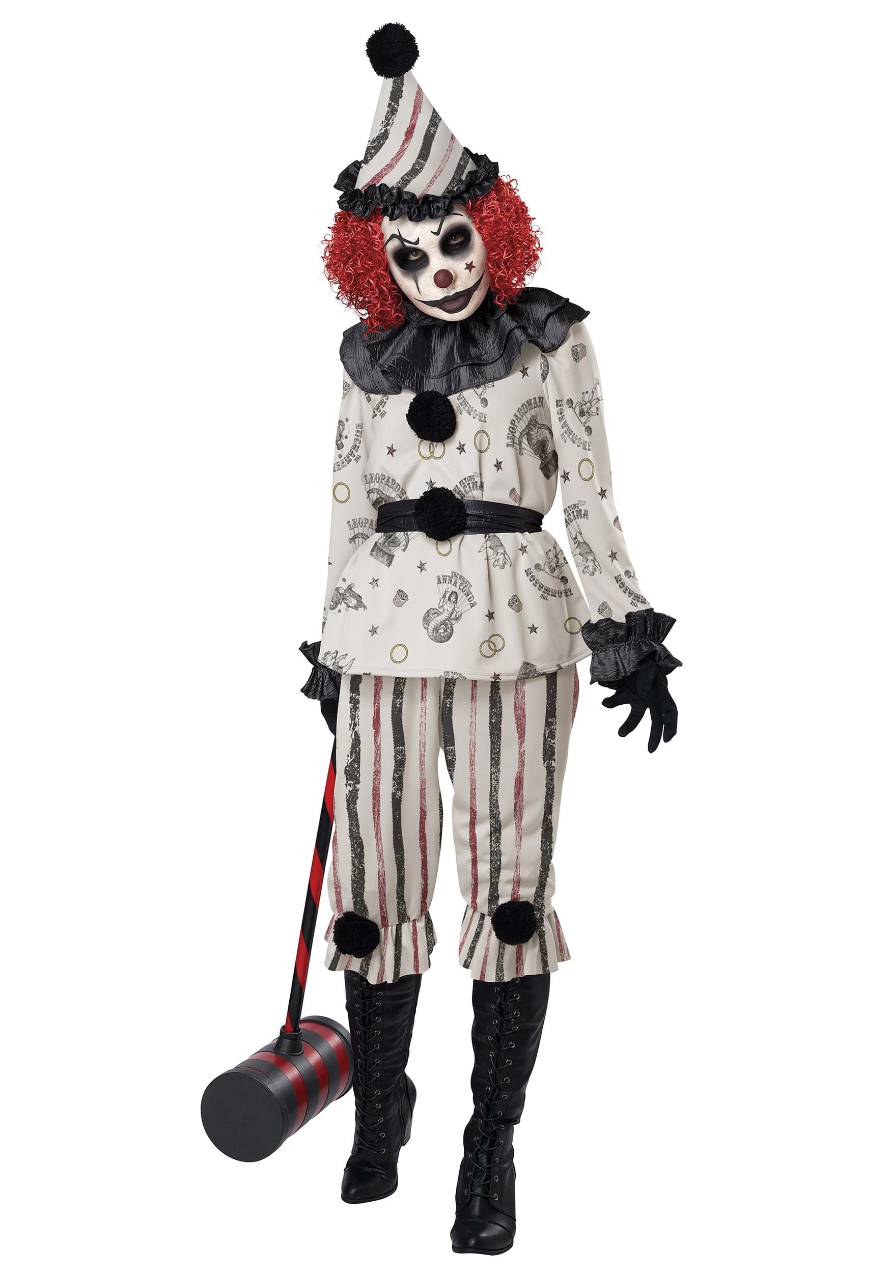 This Adult Creeper Clown Costume is comprised of a molded plastic mask, a pullover shirt, crinkle taffeta belt, and little black pom-poms all over. The foam-backed hat has an elastic chin strap, too, so you can worry less about it falling off your noggin and more about what sinister jokes you want to tell.
