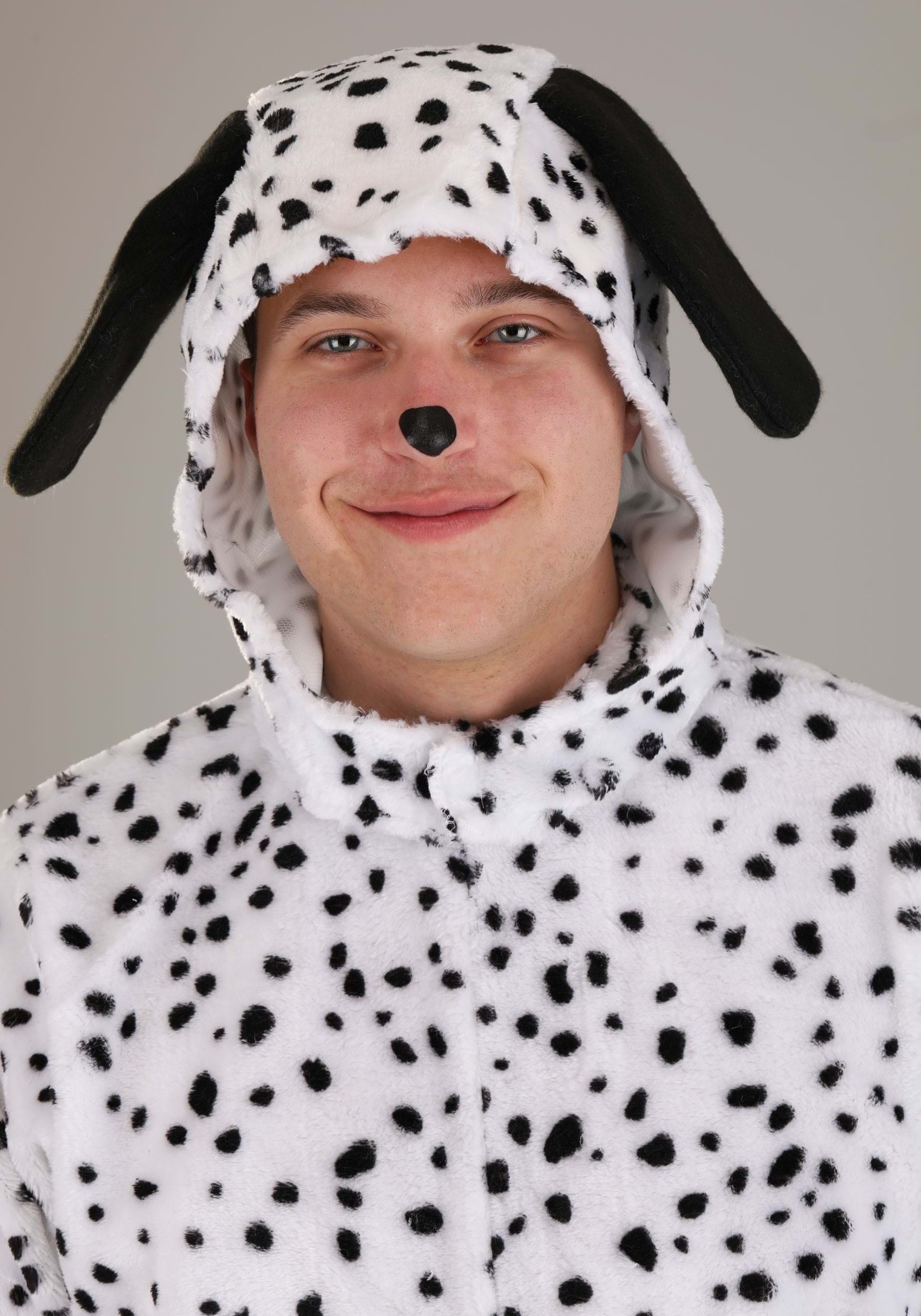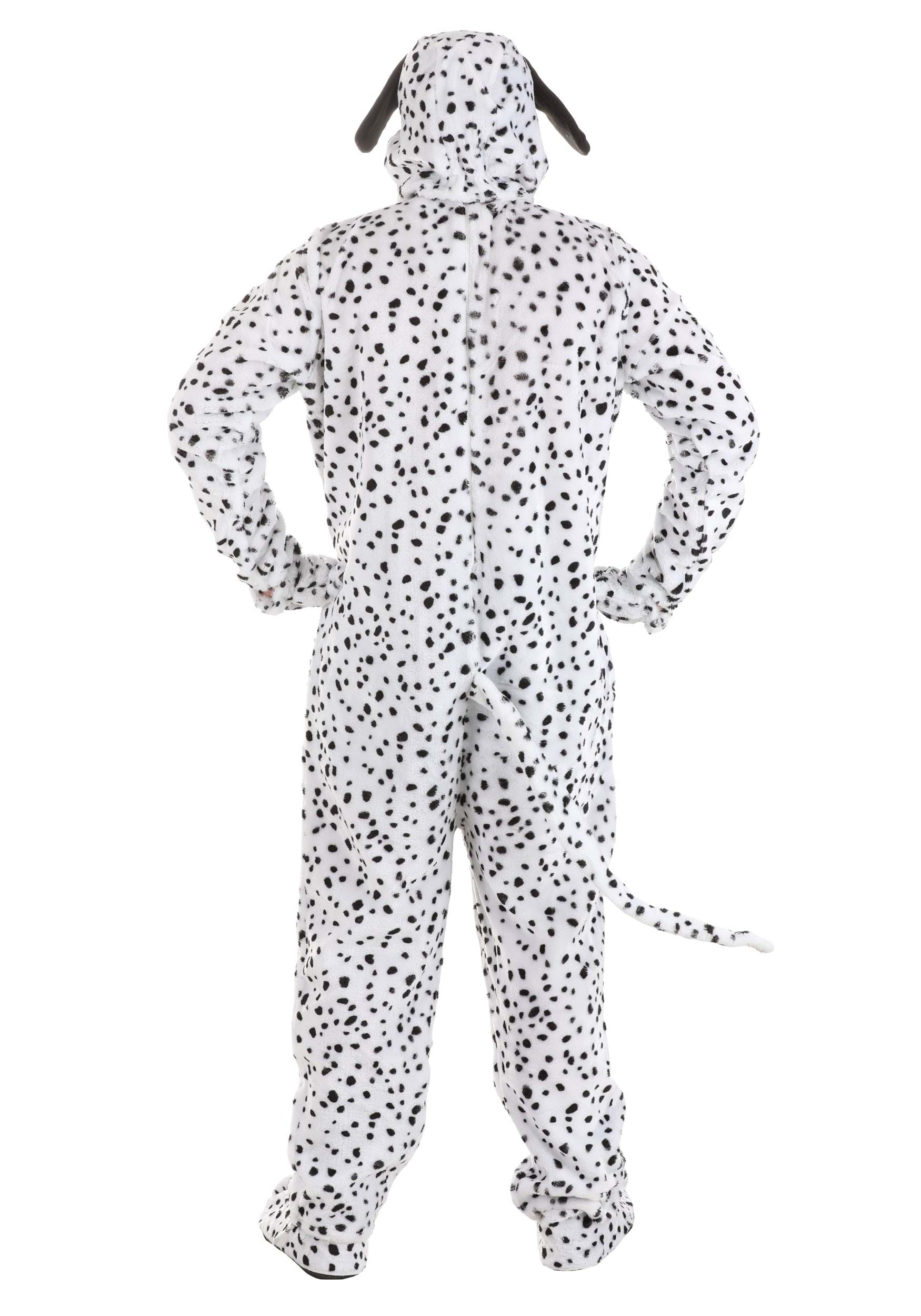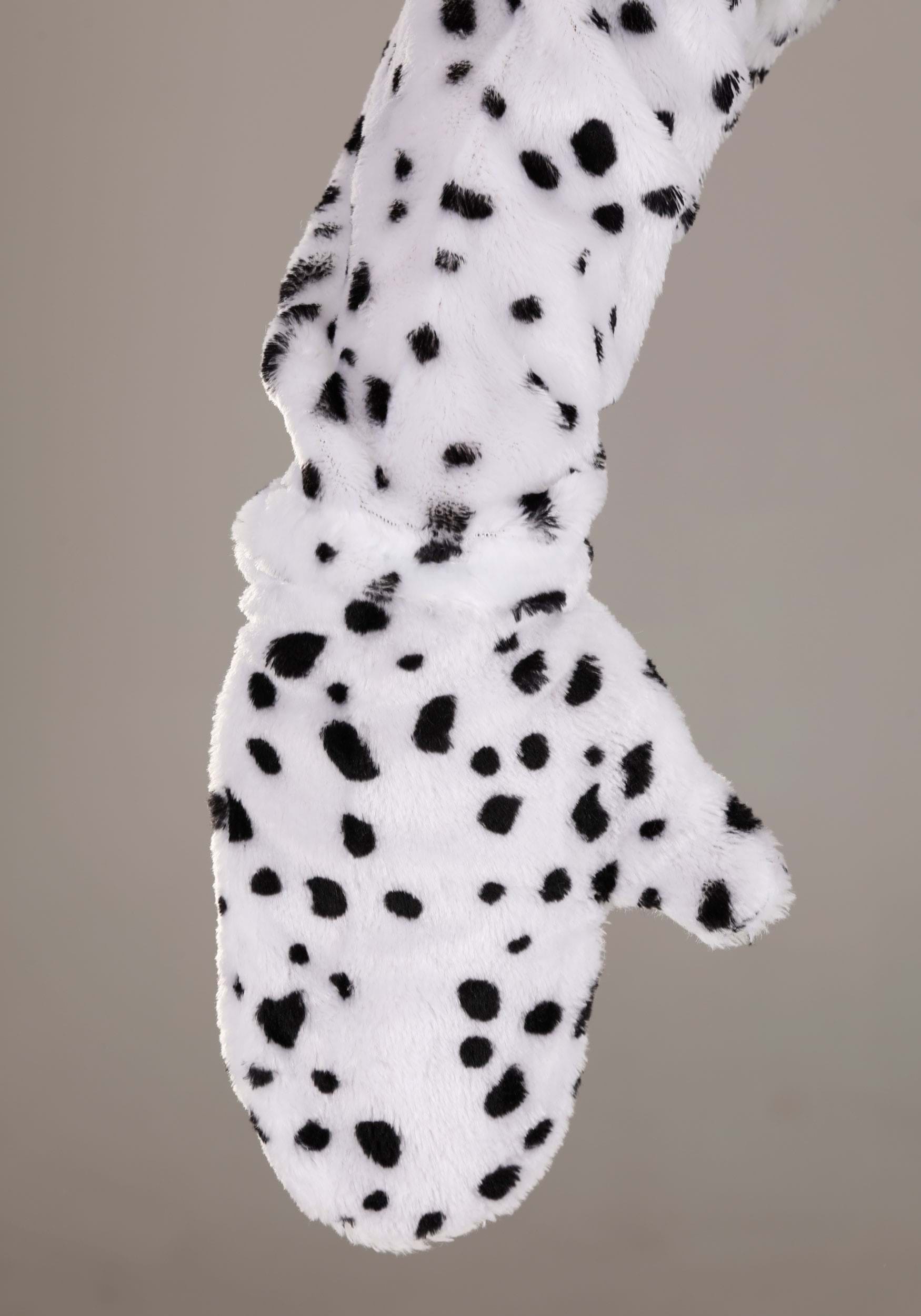 Suit up with this exclusive costume and it's sure to fulfill all of your Dalmatian aspirations. The 100% poly faux fur and felt jumpsuit has the classic black and white Dalmatian spots along with a stuffed tail sewn to the back. There are also mitts that are attached to the back of the wrists so you can get a complete look but you can also have full use of your hands (you know, for soda pop and such). The included hood has felt ears on the sides and secures closed with a Hook and Loop fastener tab under the chin. Finish off the look with matching shoe covers that have elastic underfoot and at the ankles for a secure fit. Even if you get left out in the doghouse this Halloween, this deluxe, furry costume will keep you warm all night long!