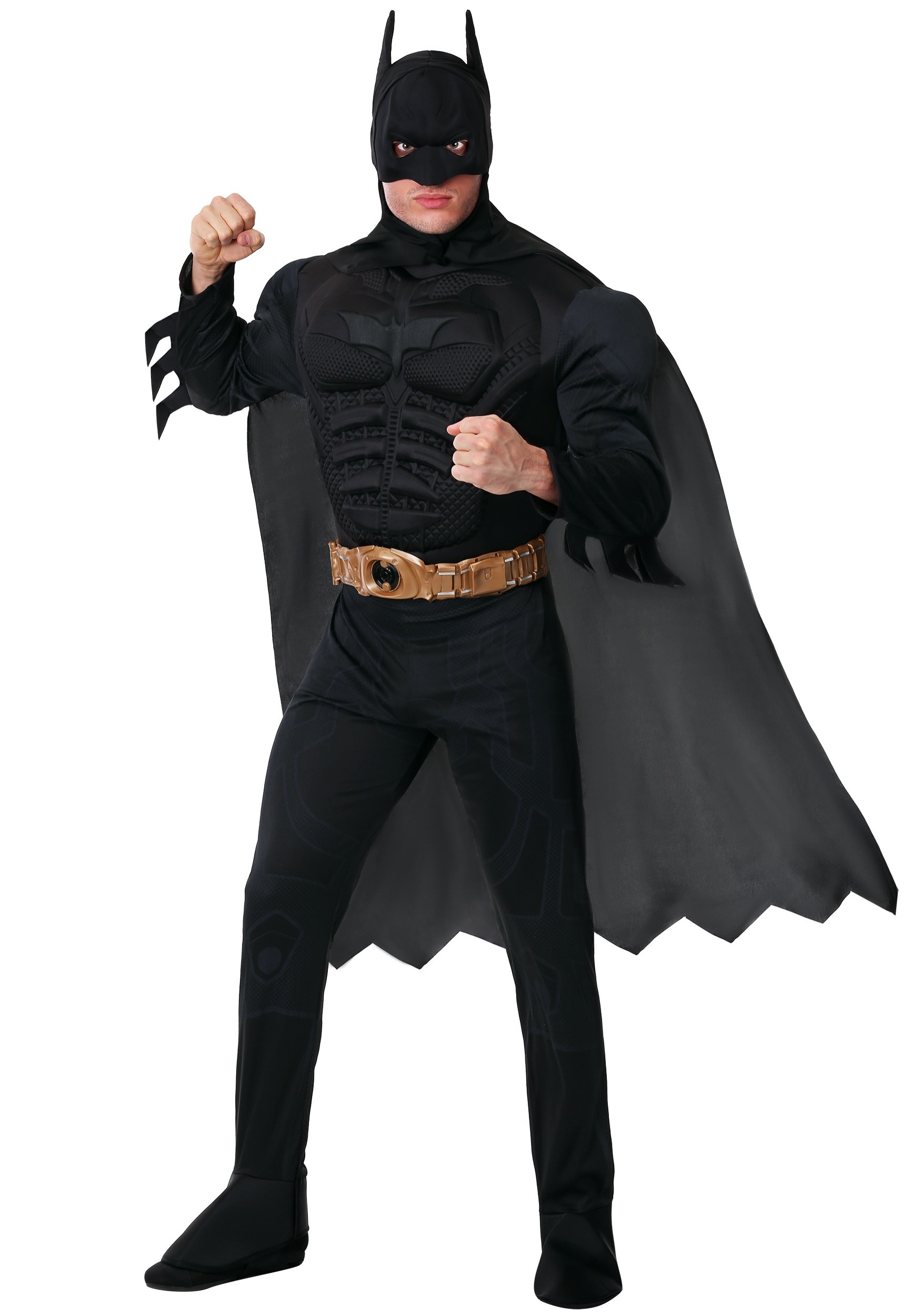 This Dark Knight costume ensemble is styled as black polyester jumpsuit with a molded foam chest and arms for a truly muscular appearance. It features attached boot tops, shoulder padding, and ridged sleeves. A matching black headpiece features a molded facemask and an attached cape. A gold molded rubber utility belt wraps around the waist and secures with ties in the back. And, it's DC Comics officially licensed from the smash hit Dark Knight trilogy