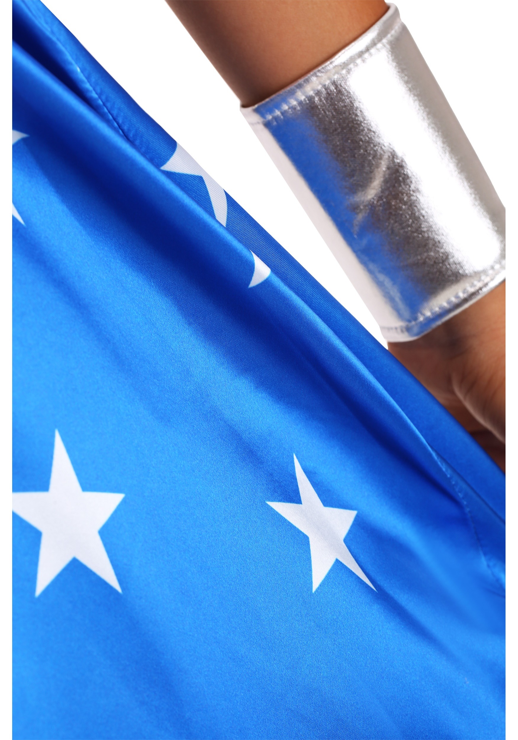 Enjoy a night off from fighting supervillains in style with this Adult Deluxe Long Dress Wonder Woman Costume. As a different take on Wonder Woman's classic Amazonian battle armor, this dress incorporates the familiar red top and gold stylized emblem and replaces the usual swimsuit style bottom with a cute and casual blue star patterned skirt. Complete the look with the included matching gauntlets and headpiece so you will still be prepared if trouble crashes your party. This costume is great as part of a superhero-themed group costume, or if you just feel like sporting a casually heroic look of your own!