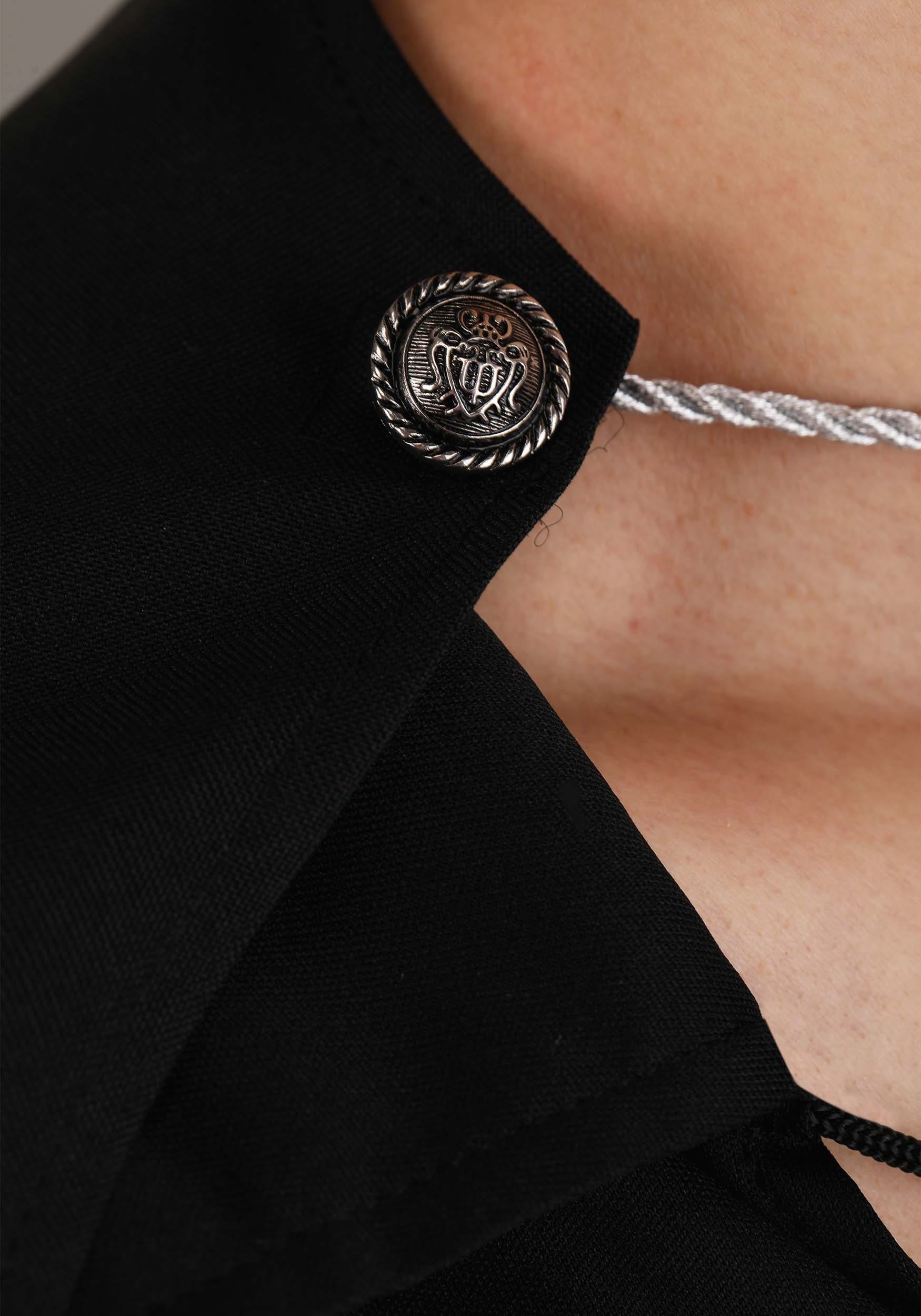 - Poplin cape has silver cord with hook and loop fastener at front neck; cord is anchored by decorative silver-tone metal buttons