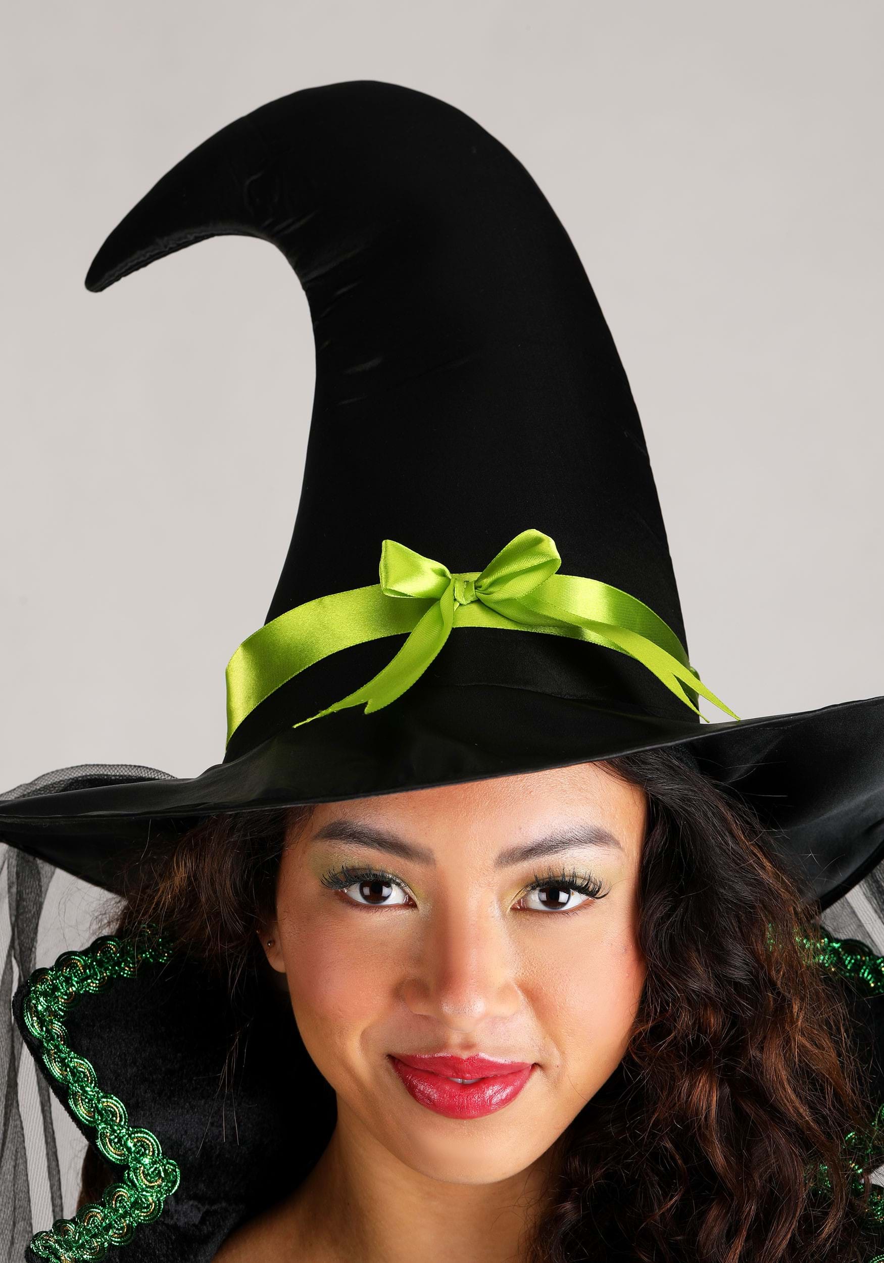 - Foam backed satin hat has wire in the rim, green satin ribbon with bow sewn on the crown on the hat, long black tulle train sewn on the hat