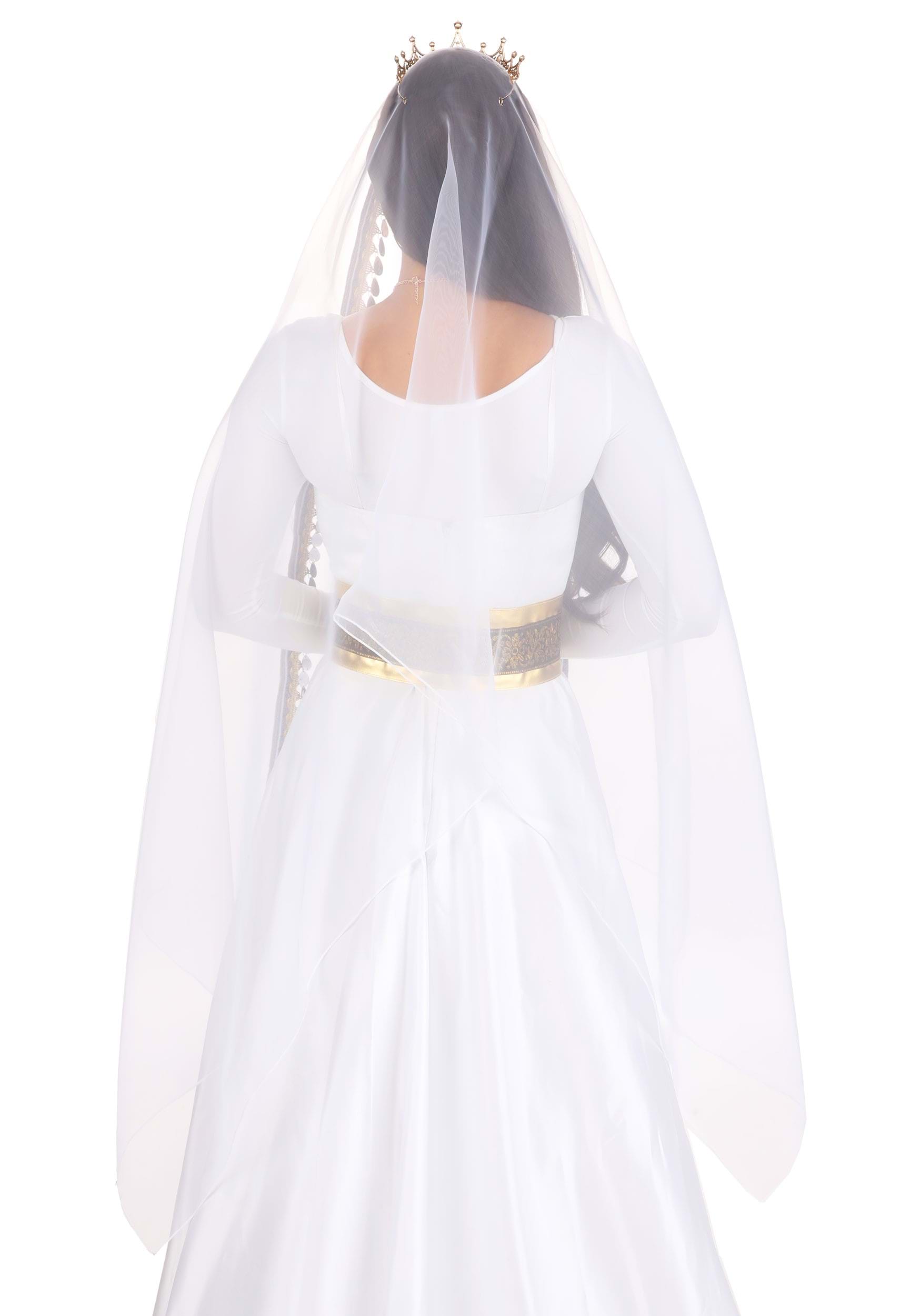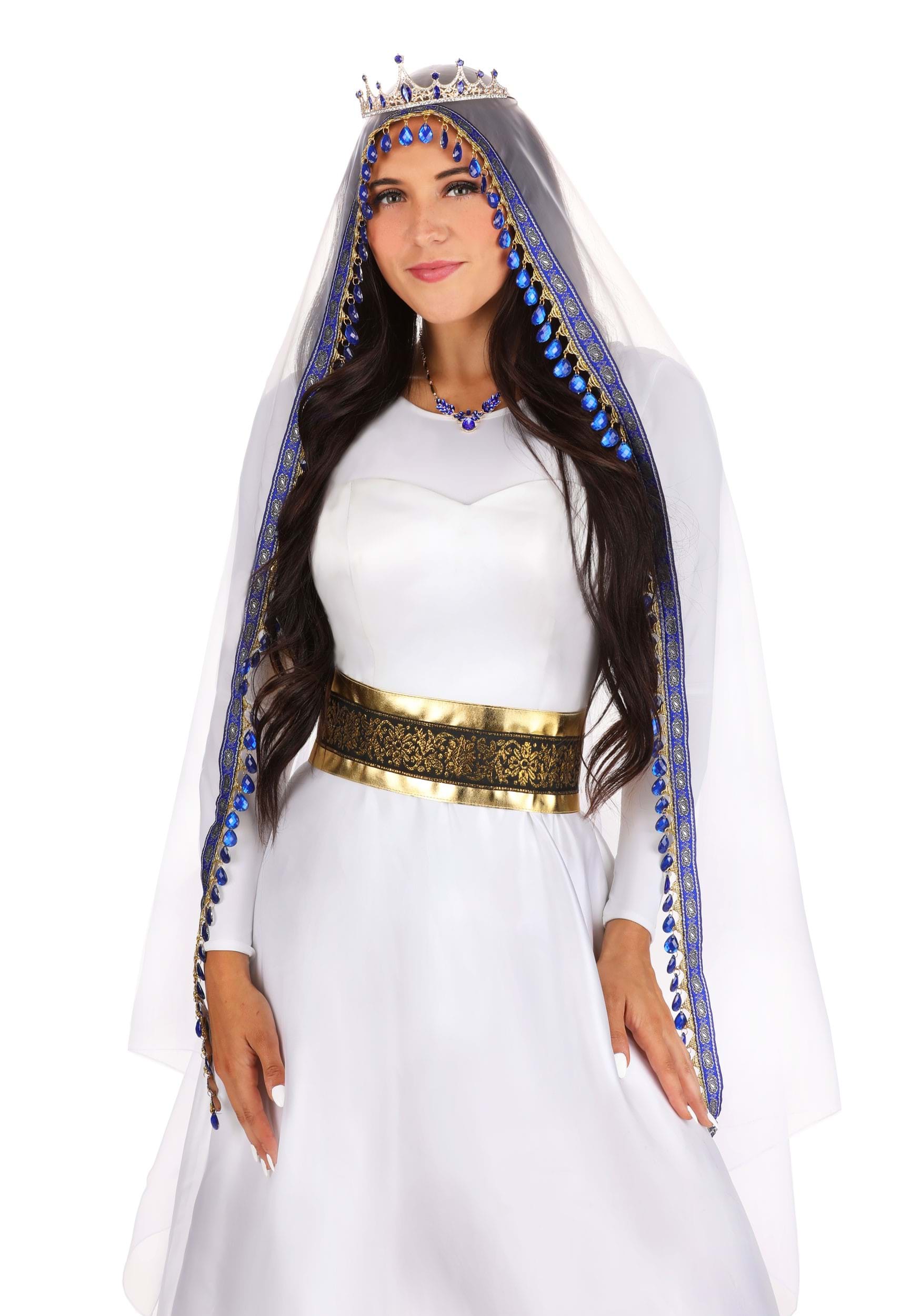 This kit includes four essential pieces to complete your Esther-inspired look. First up: the pressed vinyl crown, which is adorned with faux gems and diamonds for that just-crowned monarch sparkle. It features loops on the ends, so you can secure it with the included bobby pins or use it to hold the delicate organza veil in place. Speaking of the veil—it's trimmed with brocade and studded with faux gems, because a queen deserves nothing less.