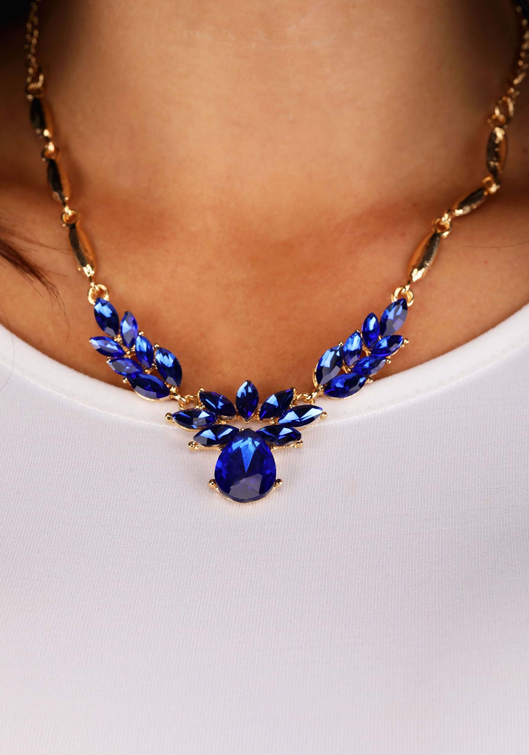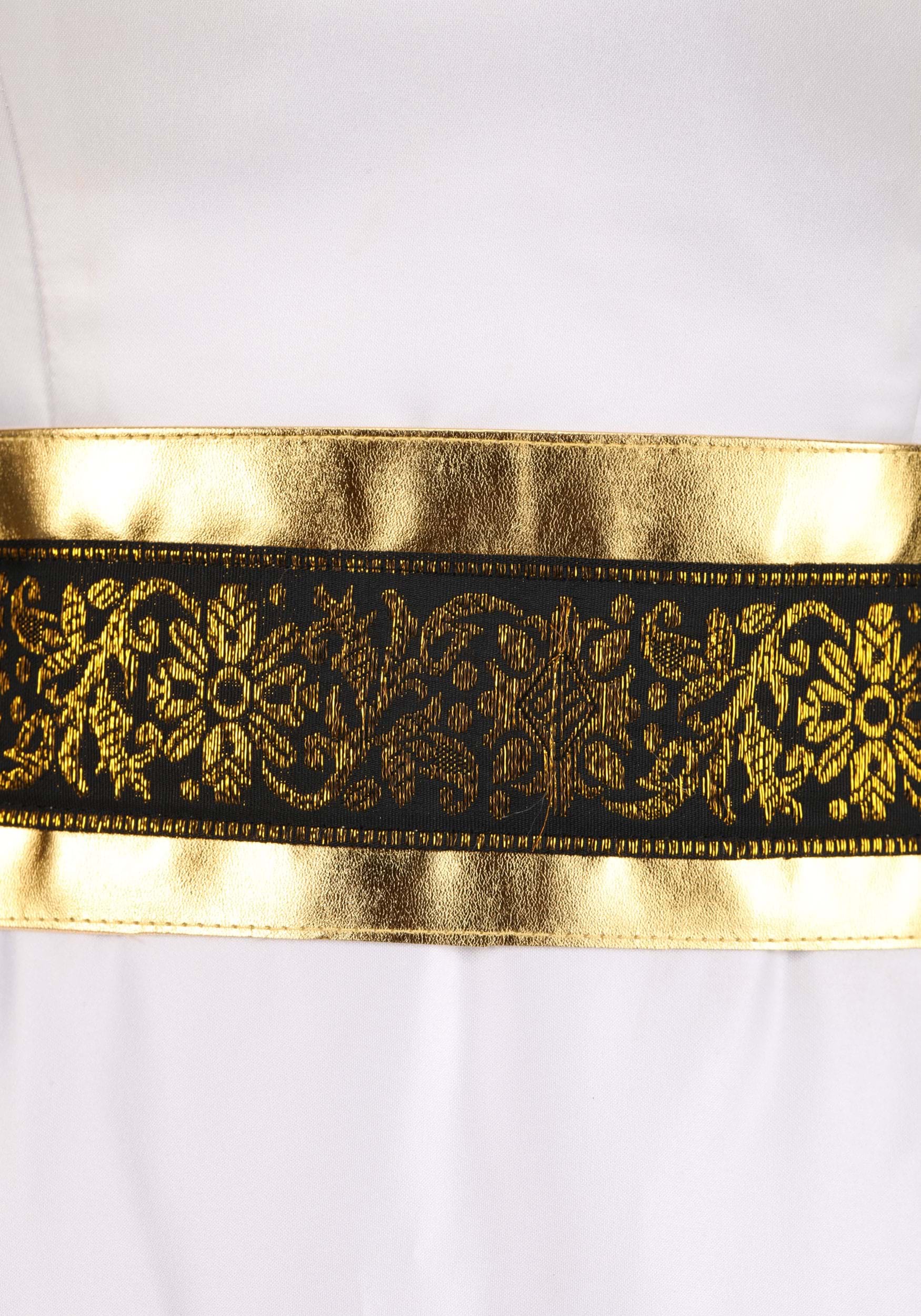 Next, there's the necklace, featuring faux gems and a lobster claw closure for a secure fit. And finally, the belt—made of brocade fabric and faux leather—fastens with a hook and loop closure in the back, cinching your look together with royal elegance.