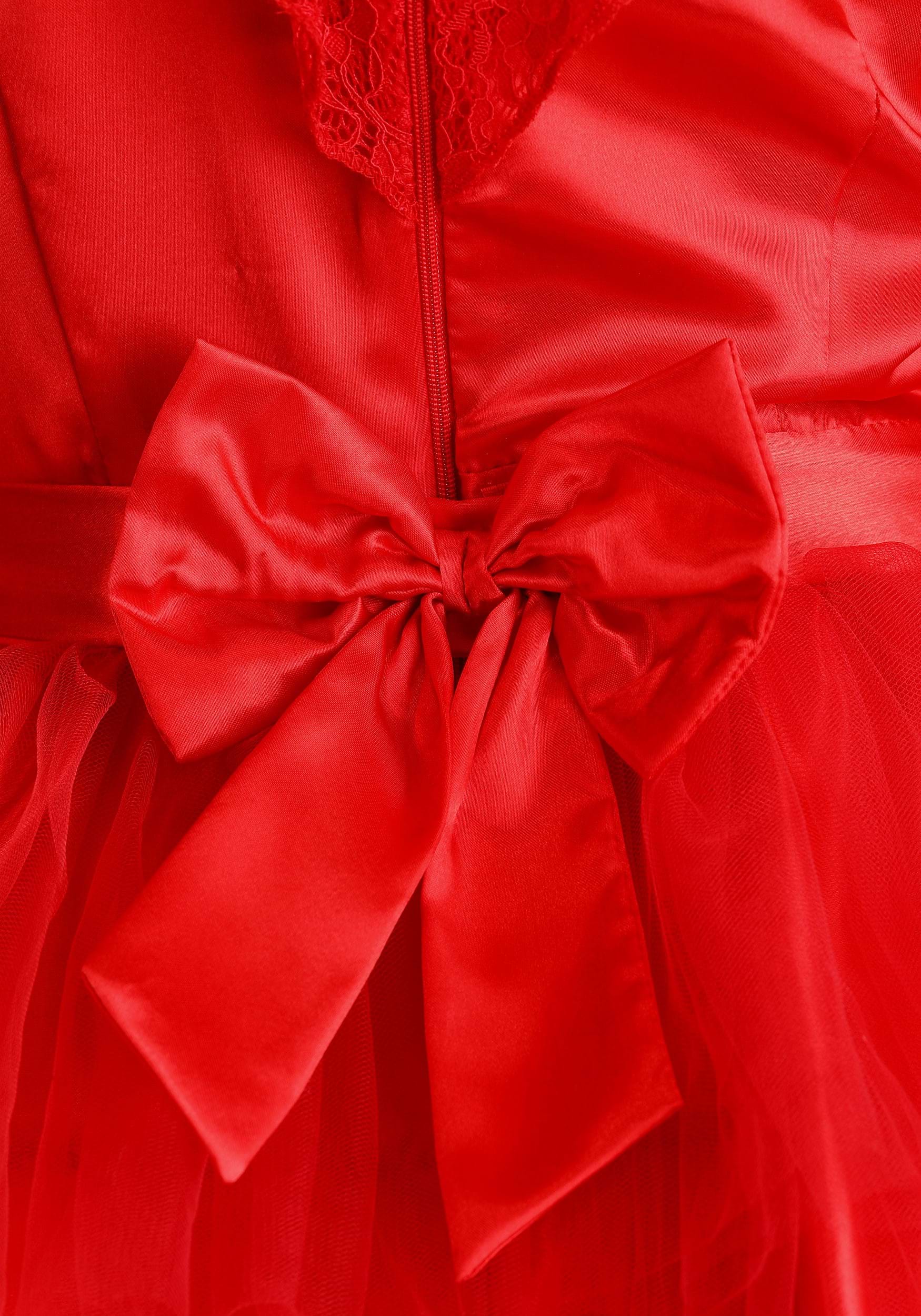 - Red satin bow sewn on the back with hook and loop faster at one side, 3 tulle layers on the skirt of the dress