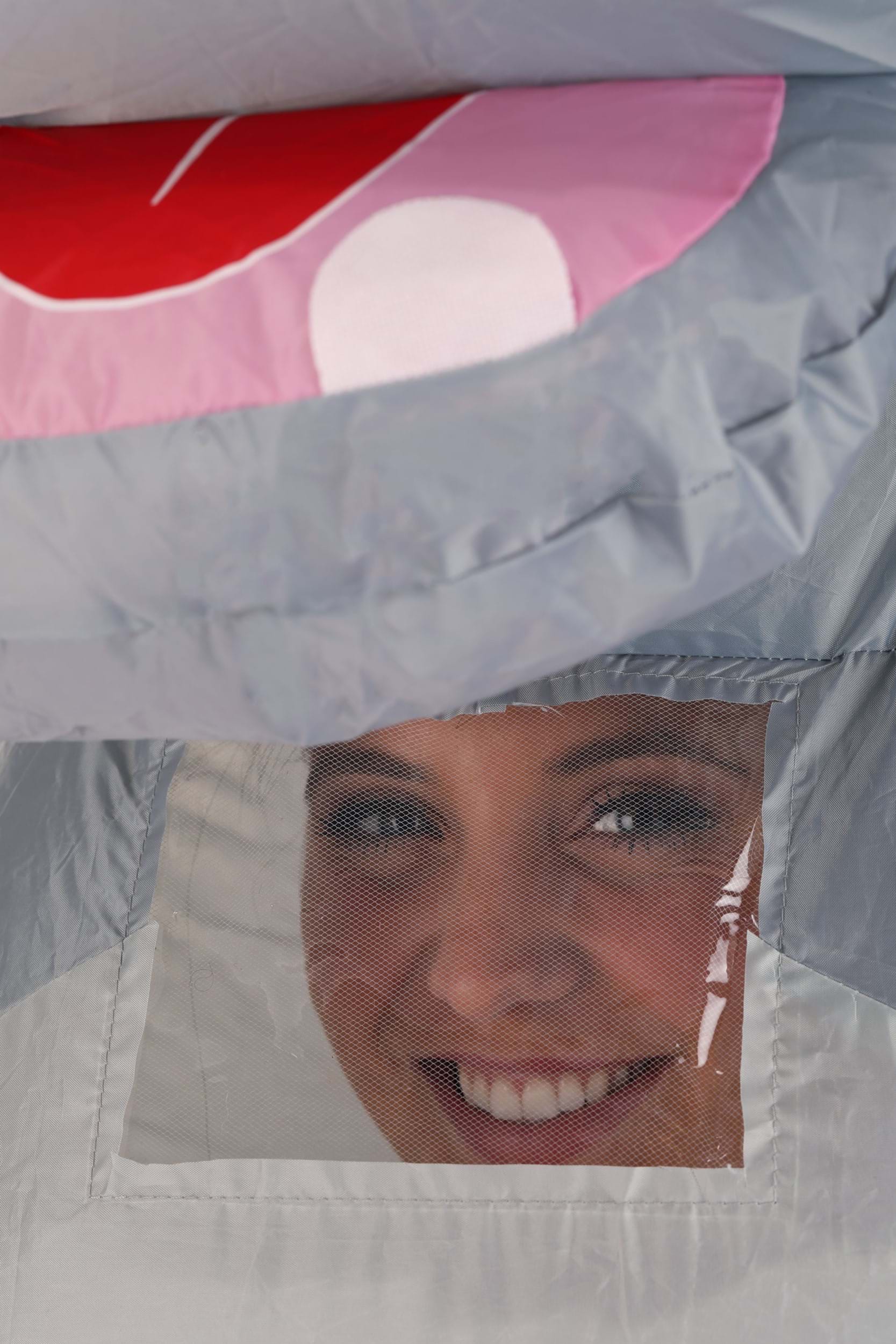 - Head is fully enclosed; clear view port in character neck for limited vision