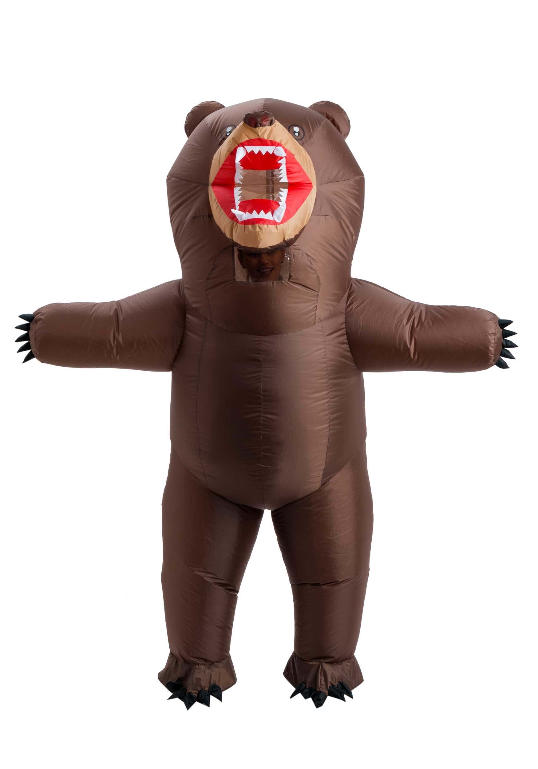This bodysuit fully inflates thanks to an internal battery pack and fan (batteries not included). The zipper pull is inside the costume, so you can get in and out of it yourself, and there is a clear panel in the bear's mouth so you can see the world as you prowl through it.