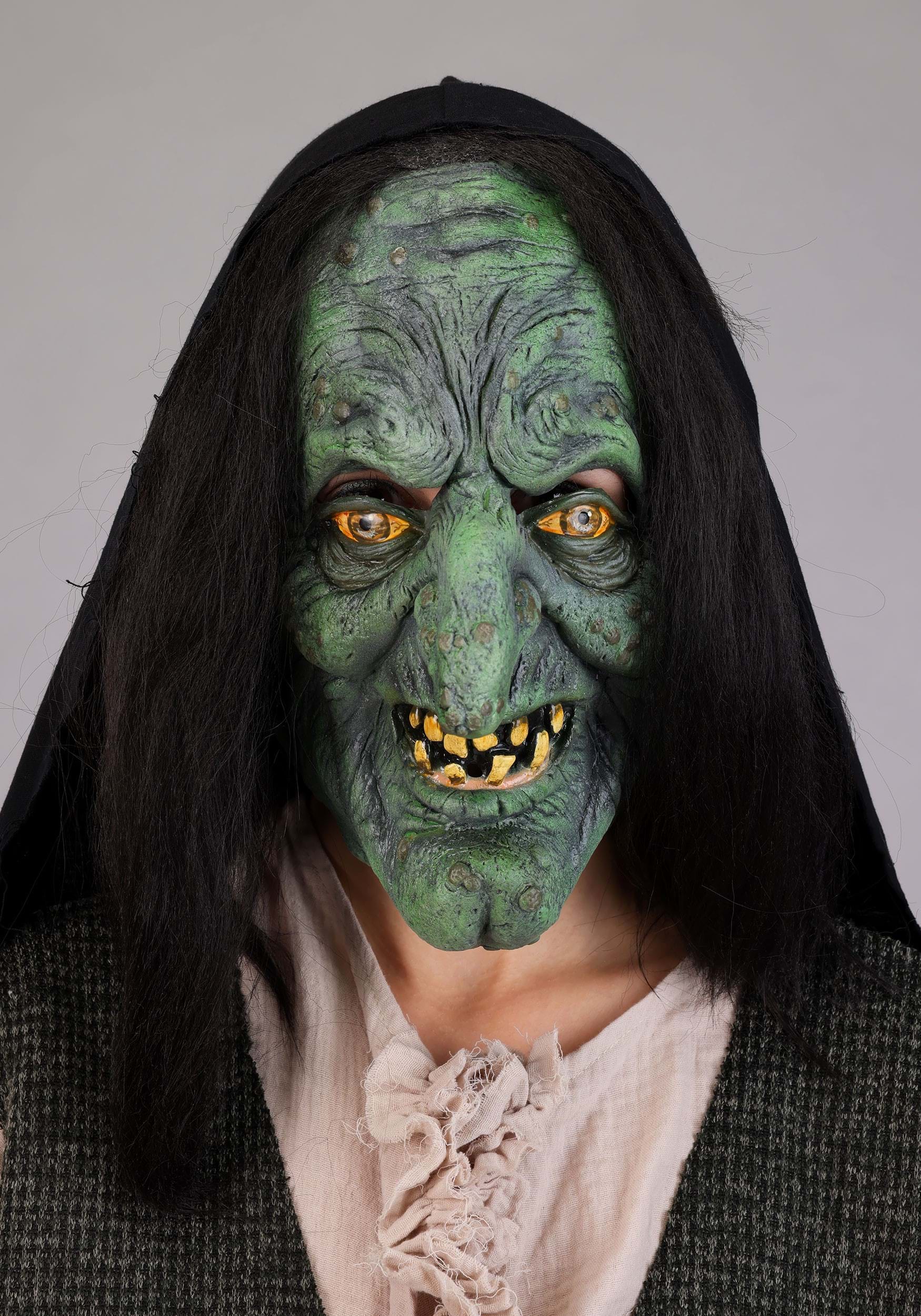 Completing this eerie ensemble is a frightening mask of molded latex, which makes your transformation complete. Framed by synthetic black hair, it's a visage of pure terror. The forearm-length latex hands, while exuding an uncanny realism, are ready to grip wands or perhaps the nightmares of the unsuspecting. And the pouch, adorned with cryptic metal charms, is where secrets, or perhaps potent poisons, find their resting place.