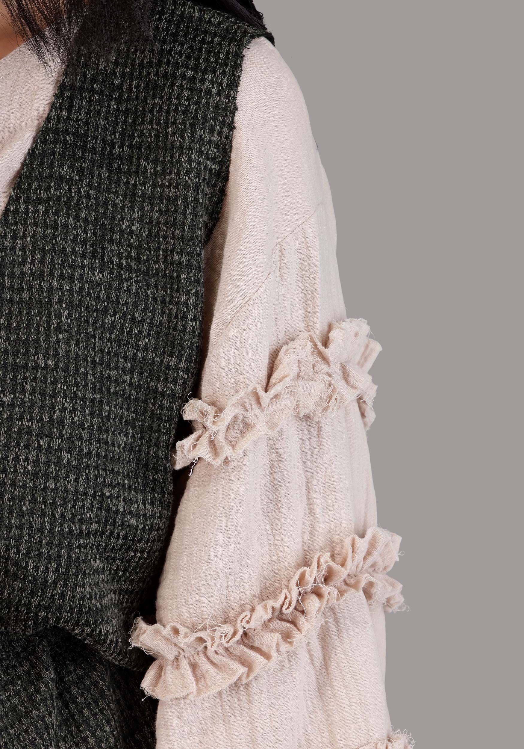 - Sleeves have elastic cuffs, rows of circumferential ruffles