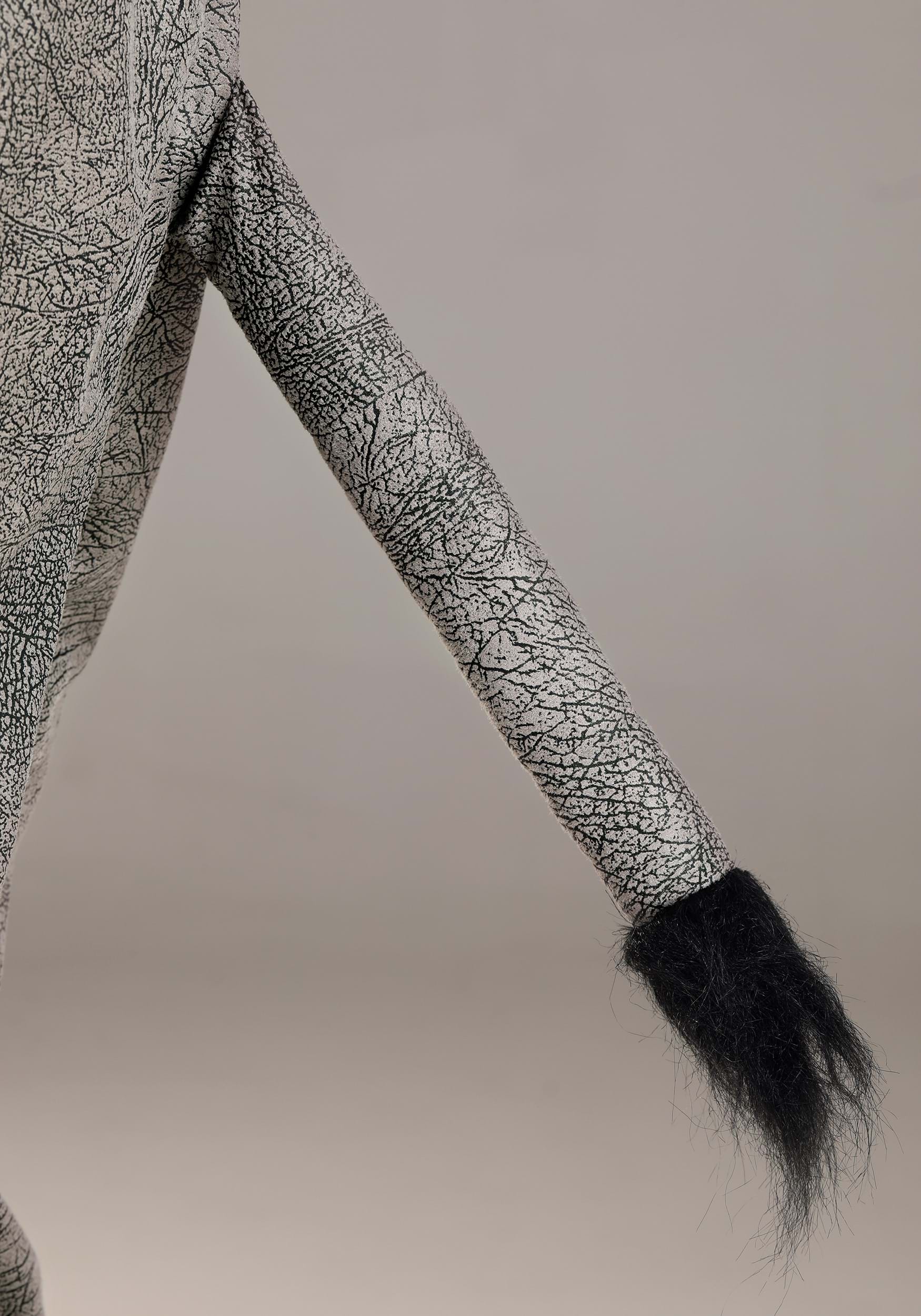 - Embroidered & appliqued faux suede and toenails on sleeve cuffs & front edge of shoe covers