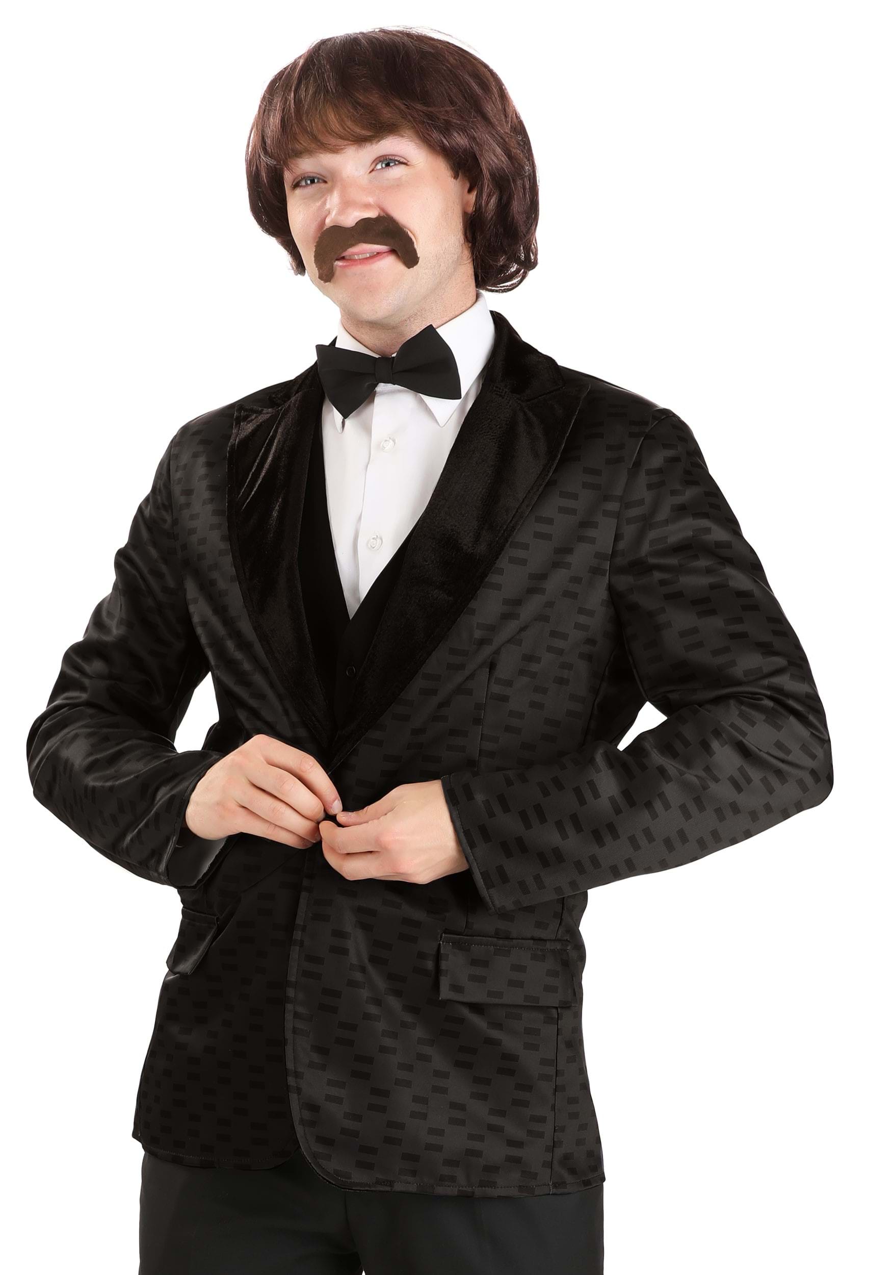 The 4-piece ensemble includes a textured black poly twill blazer with a subtle pattern, sleek velboa lapels, and a single-button closure for that classic showbiz vibe. The matching black vest has just the right amount of stretch for comfort and closes with a row of buttons down the front. A coordinating poly twill bowtie with an elastic band slips easily around the neck, while the finishing touch—a faux fur mustache with adhesive backing—locks in the Sonny look. (Note: wig, white shirt, and pants sold separately.)