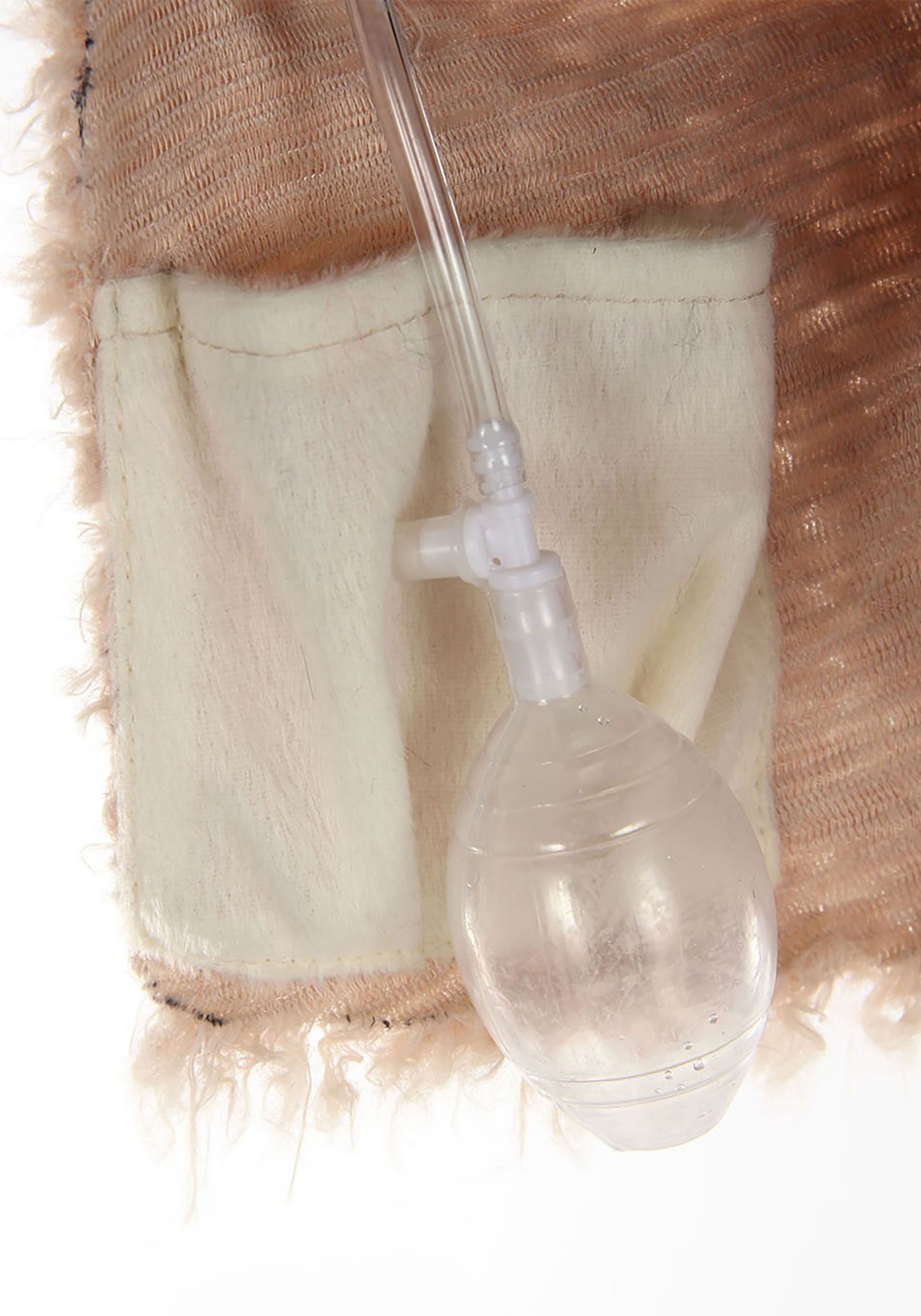 - When bulb is filled with water, squeezing it sprays water from muzzle of hat