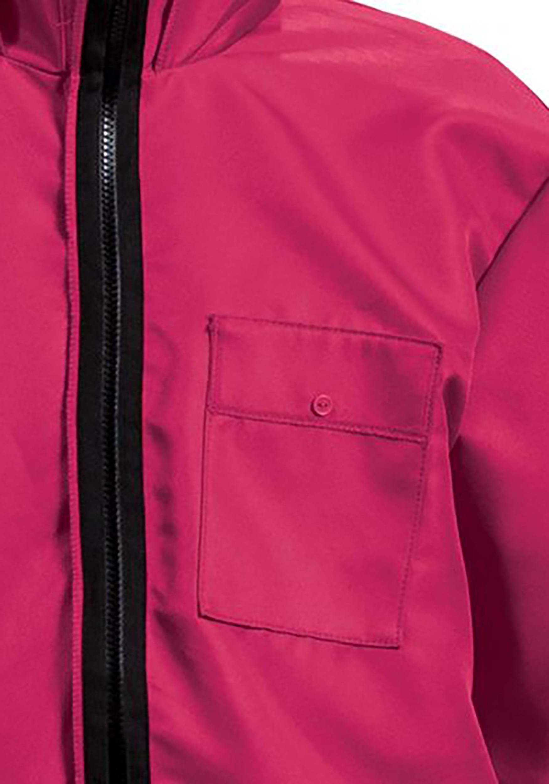 - Jumpsuit closes at front with hook and loop fastener behind decorative zipper