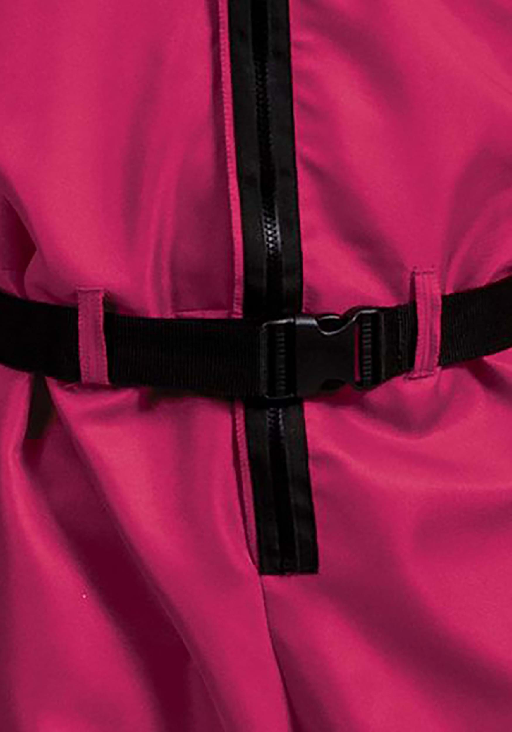 - Polypropylene webbing belt threads through loops at waistline of jumpsuit, fastens with plastic parachute buckle