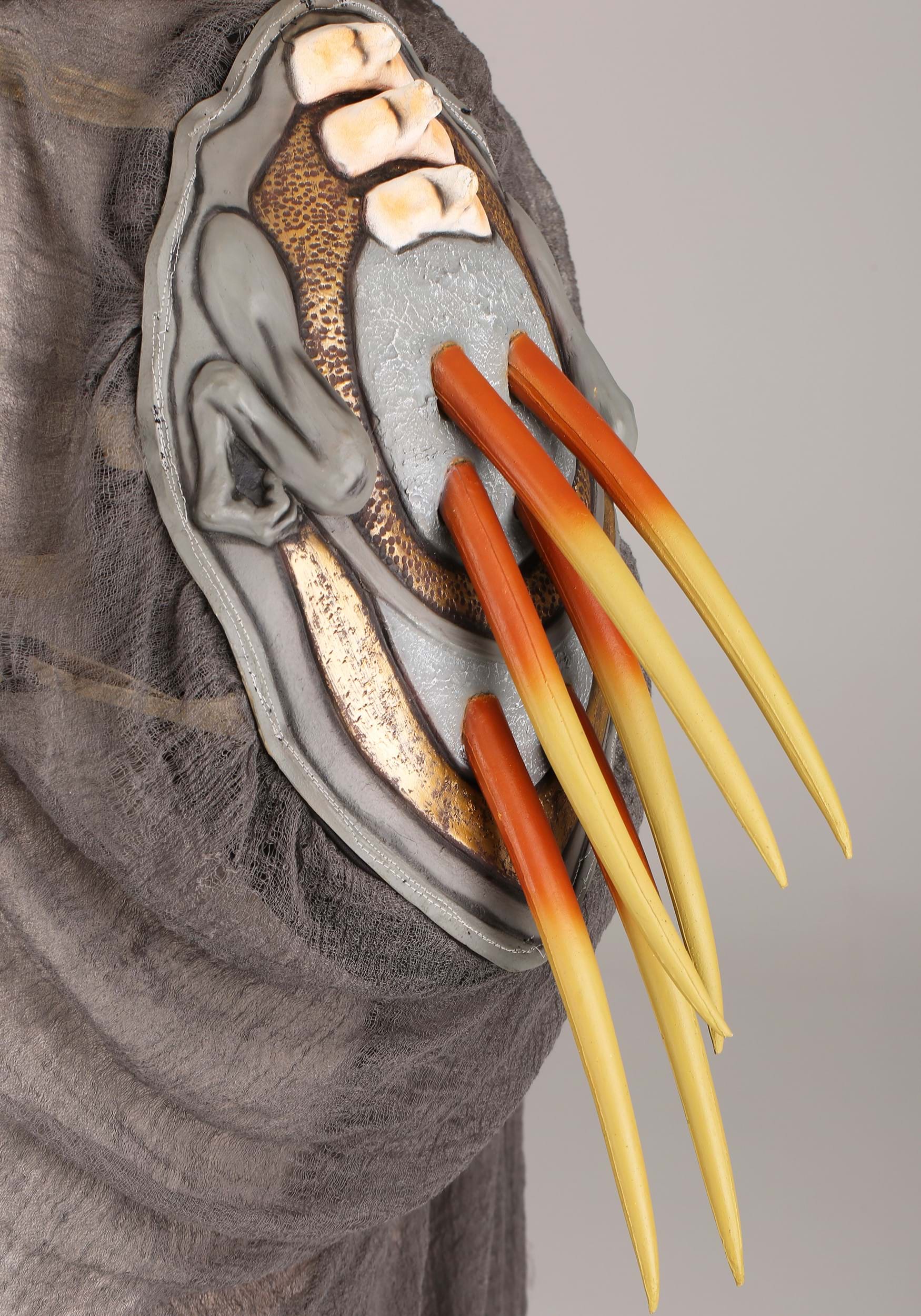 Answer the call of fate and seek eternal fun with this Dark Crystal Skeksis costume. This is a Made By Us design that brings to life the Jim Henson classic thanks to this complete ensemble. You'll start with a full-length off-white robe, a tattered gray cheesecloth cloak, a Skeksis mask, and a pair of Skeksis hand gloves. Lacy cuffs and billowing fabric could have had you looking quite noble... until you slip your arms into the straps of the back piece. Two-tone spikes come out of the Skeksis shell. The attached gray cheesecloth can be worn over your shoulders to create the look of an aged cloak. For the final transformation, wear the Skeksis mask and oversized gloves and you've created a true Conjunction! (Note the limited visibility from the mask.)
