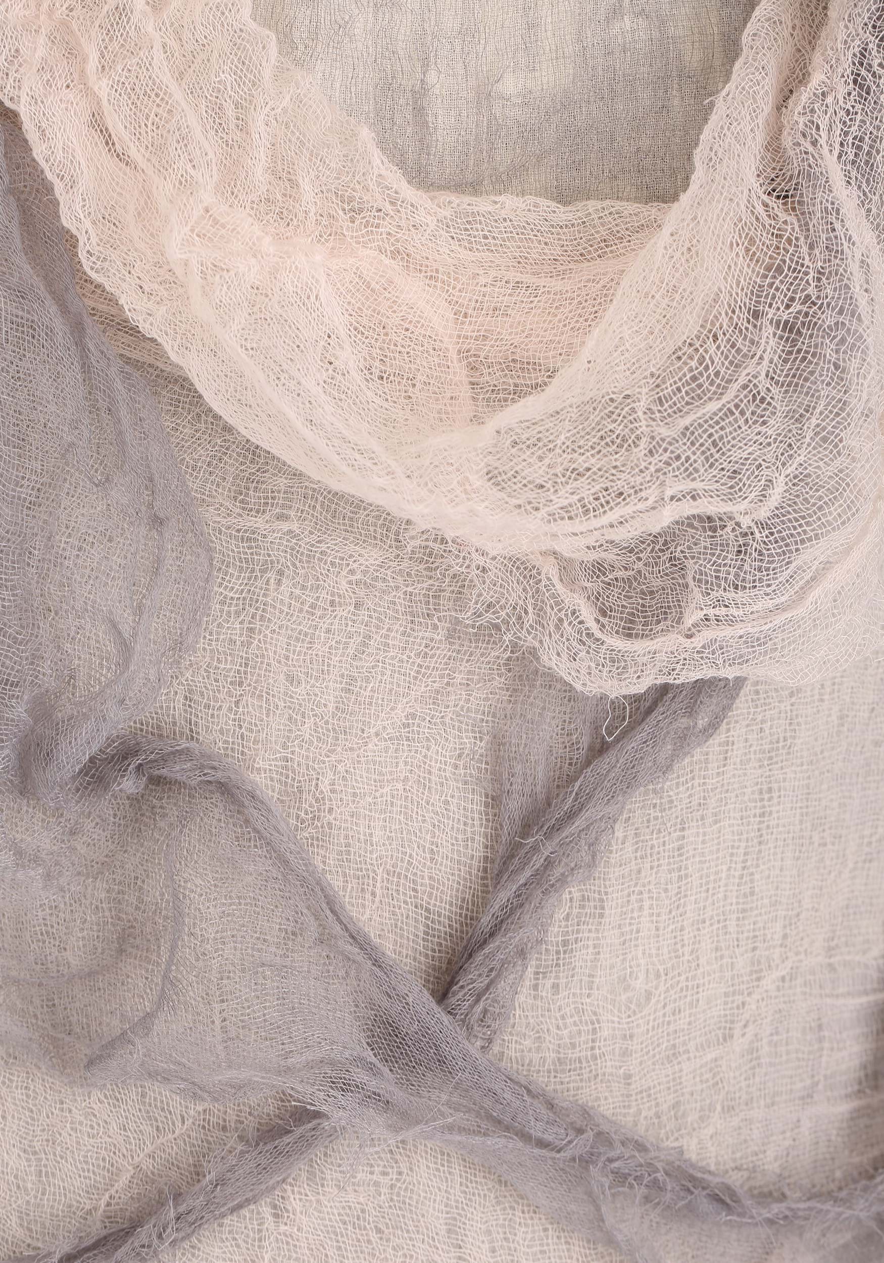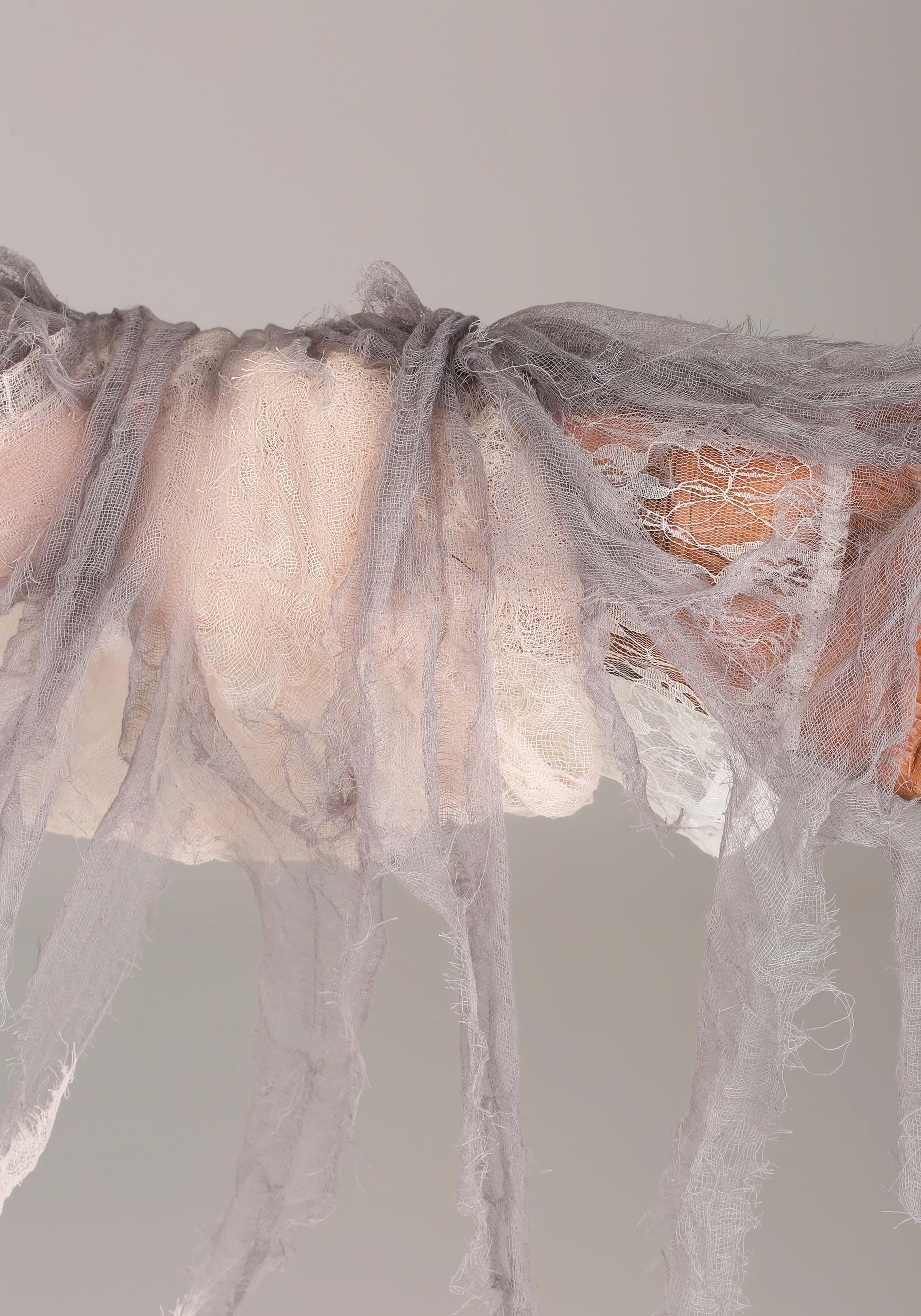 - Pullover robe has cream gauze base layer, gray cheesecloth overlay