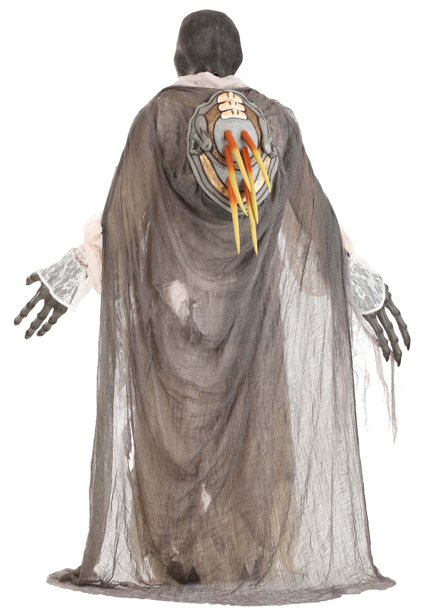 - Gray cheesecloth cape has latex shell over cushion that gives a hunchback appearance