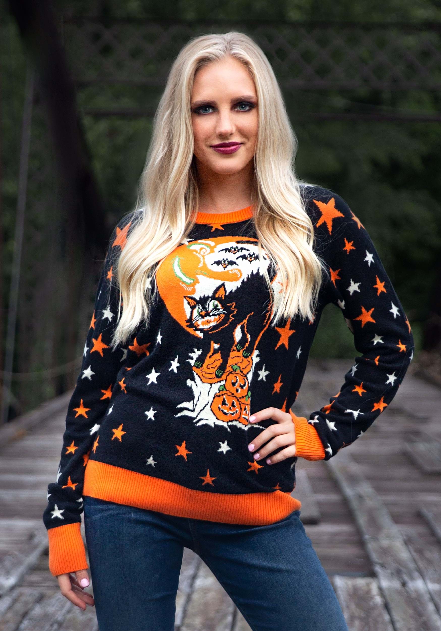 Well, this Vintage Halloween Cat Halloween Sweater may not give you the power to control cats. It will, however, give you a witch's familiar in the form of a cozy sweater to wear through the spooky season this year! The sweater is crafted out of a cotton and acrylic blend that's warm and comfortable, especially on those cool autumn days. It comes with a knit-in design of everything Halloween on the front, which includes a black cat, a mischievous moon in the background, and a pile of classic Jack o' Lanterns. It's perfect for cultivating a 'casual witch' look this year!