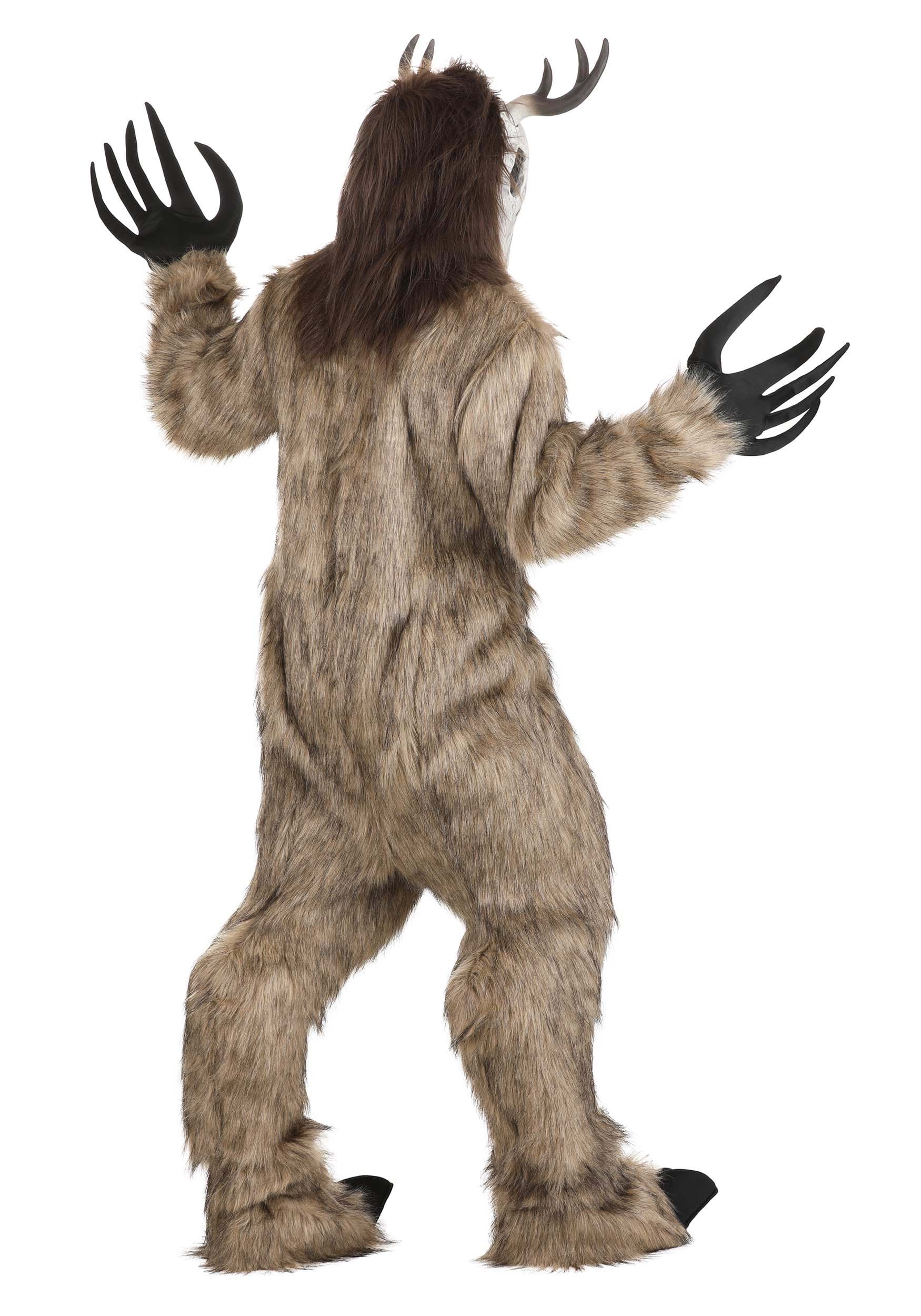 The legend is true: this exclusive Wendigo Adult Costume is the perfect scary outfit for Halloween! The jumpsuit has hook & loop fastener at the back and is made of soft brown long pile faux fur. A molded rib cage is attached to the chest to make it look like the creature is decaying while still alive. Shoe covers conceal your shoes and gloves with extra-long fingers will terrify your victims - er, your friends - as you reach in their direction. The hood/mask looks like a bleached skull and has attached antlers.