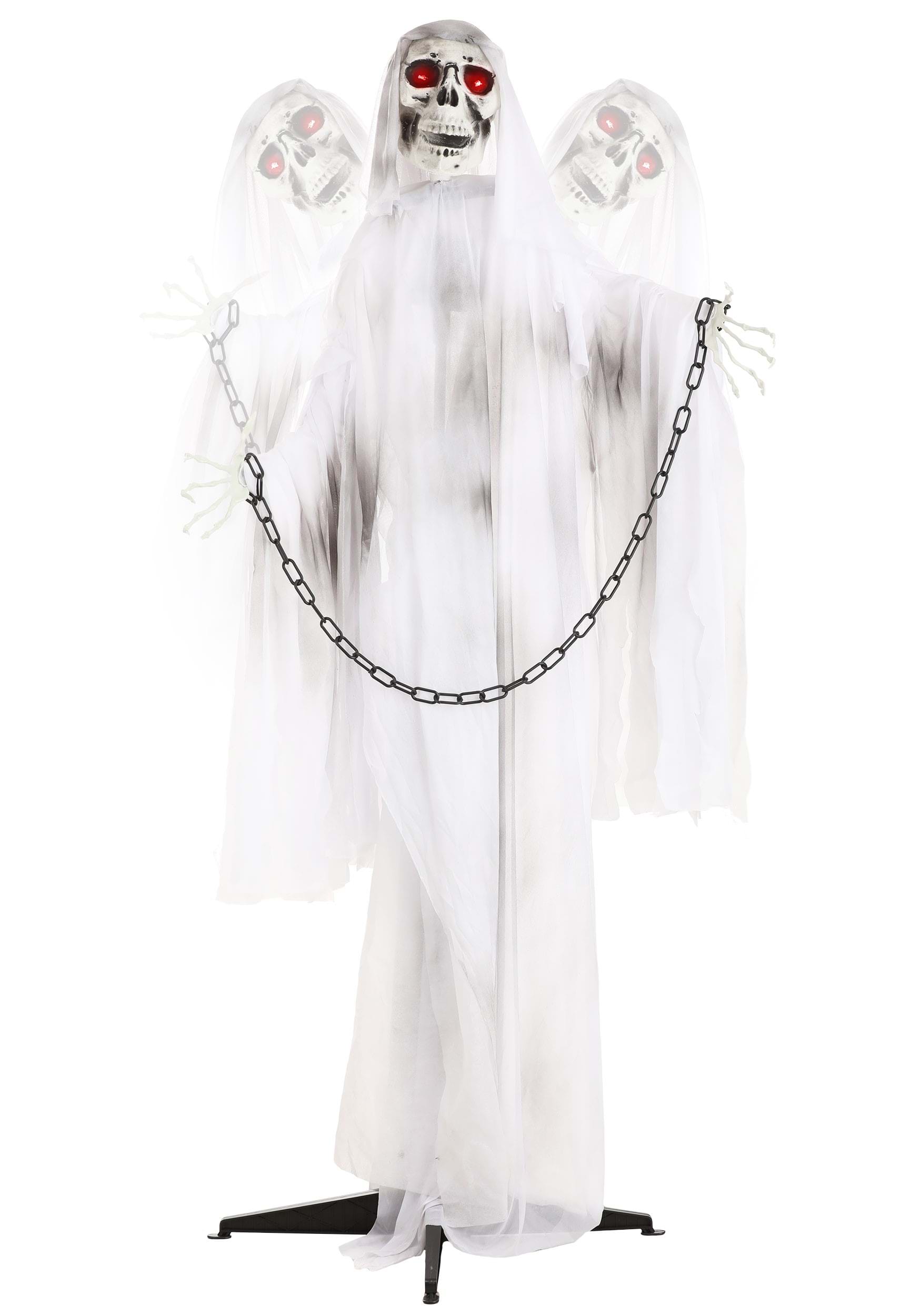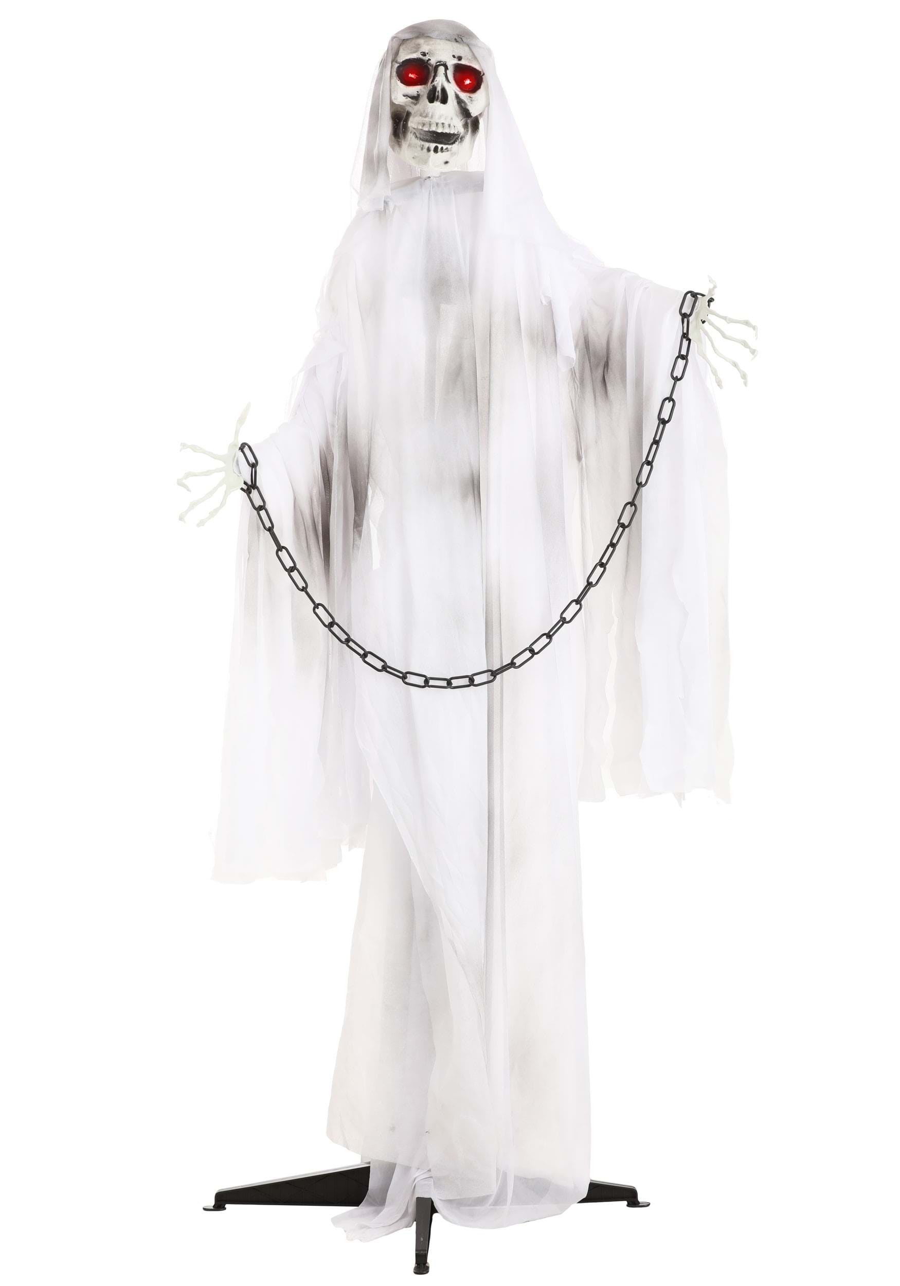 This Chained Ghost Animatronic Halloween Decoration may lost his power to move around freely, but he has gained the ability to frighten the wits out of anyone who sees him! The skeletal ghost's eyes glow red, and his chained arms move as a visitor approaches. Do us a favor and make sure those chains stay on. We're not saying something would happen - but anything can happen on Halloween! Best to take precautions.