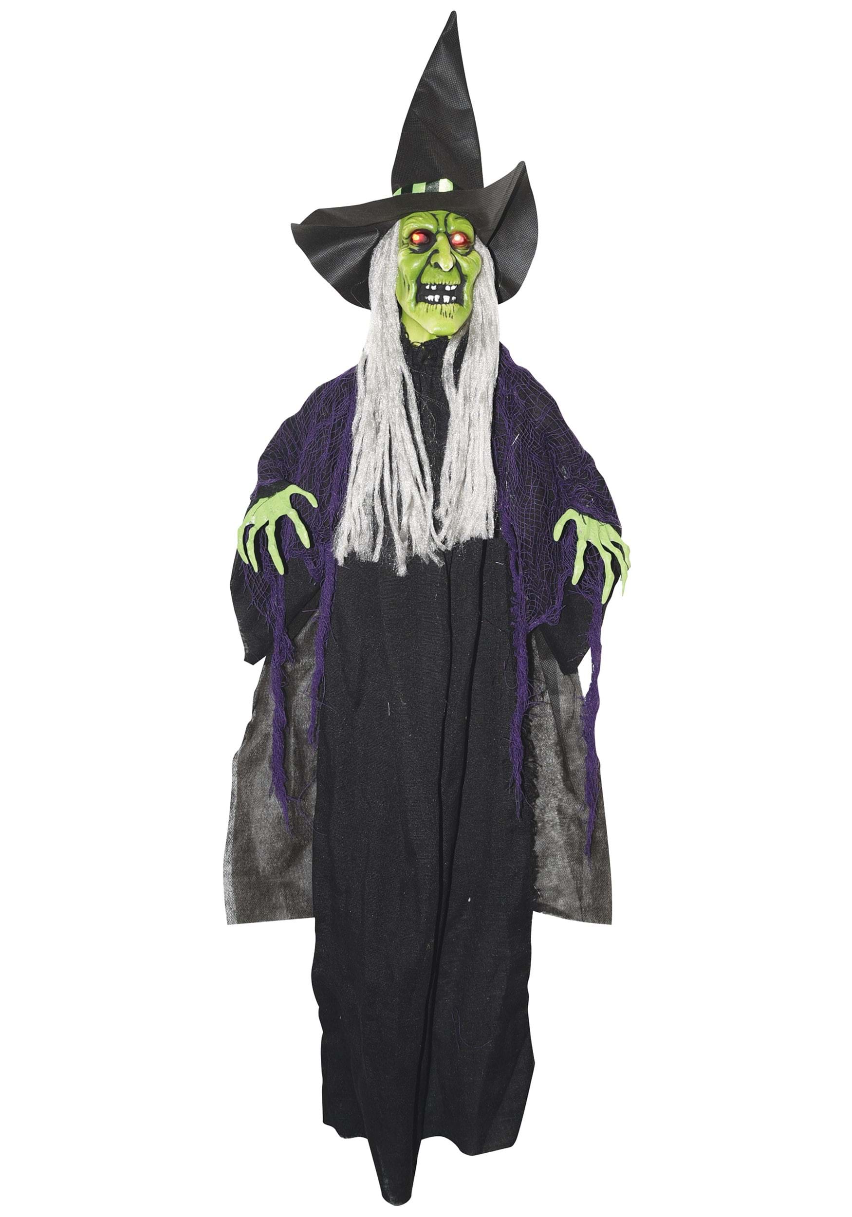 This witchy figure is sure to send shivers of excitement through passers-by. The sculpted head has eyes that light up. Gray hair frames her face, creating a life-like appeal. Her boney hands are creeping out from her netted clothing while the robe hangs down loosely so it can catch in the wind on an Autumn night. Perfect for indoors and outdoors, this witch will make your Halloween decor pop for years to come!