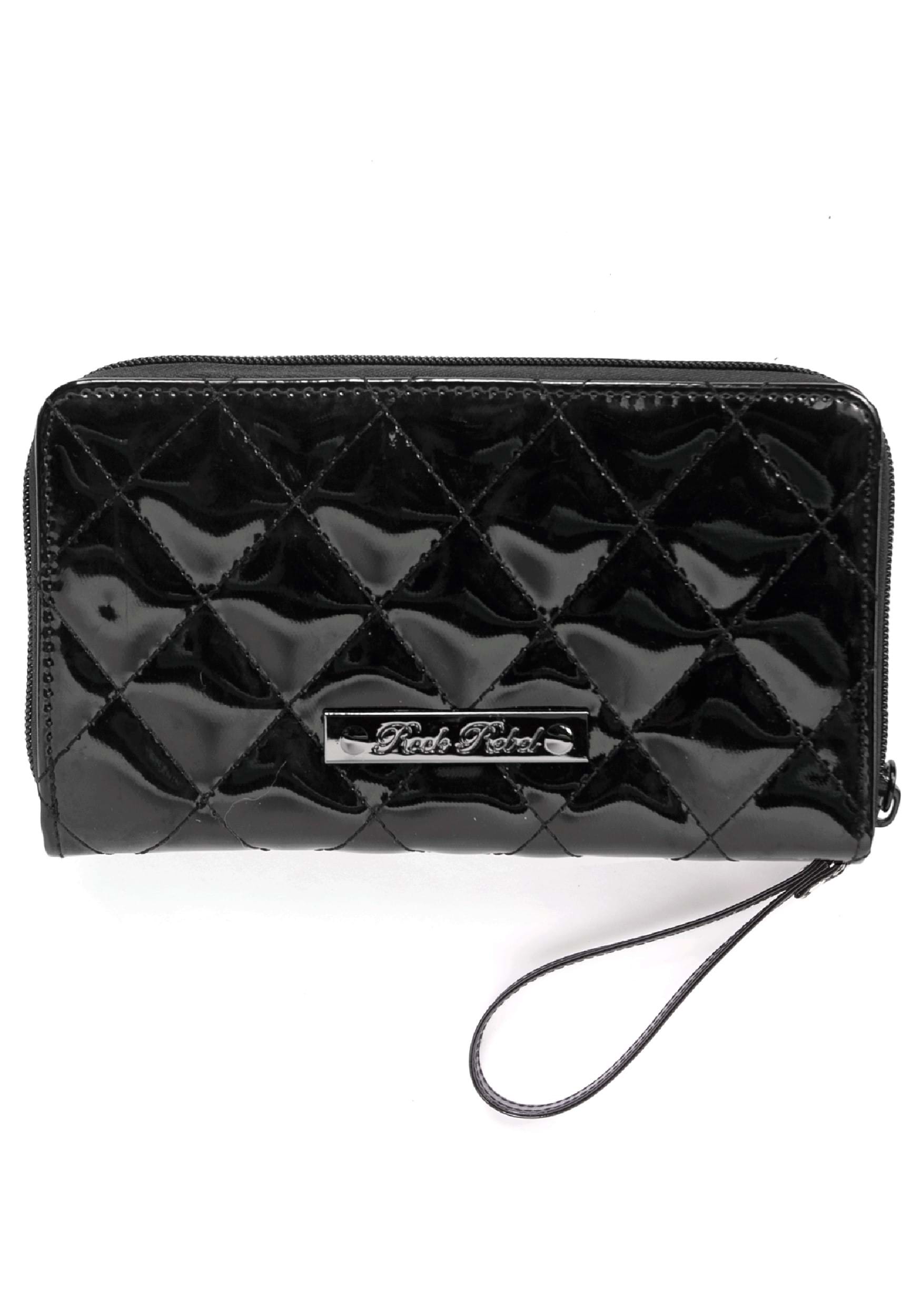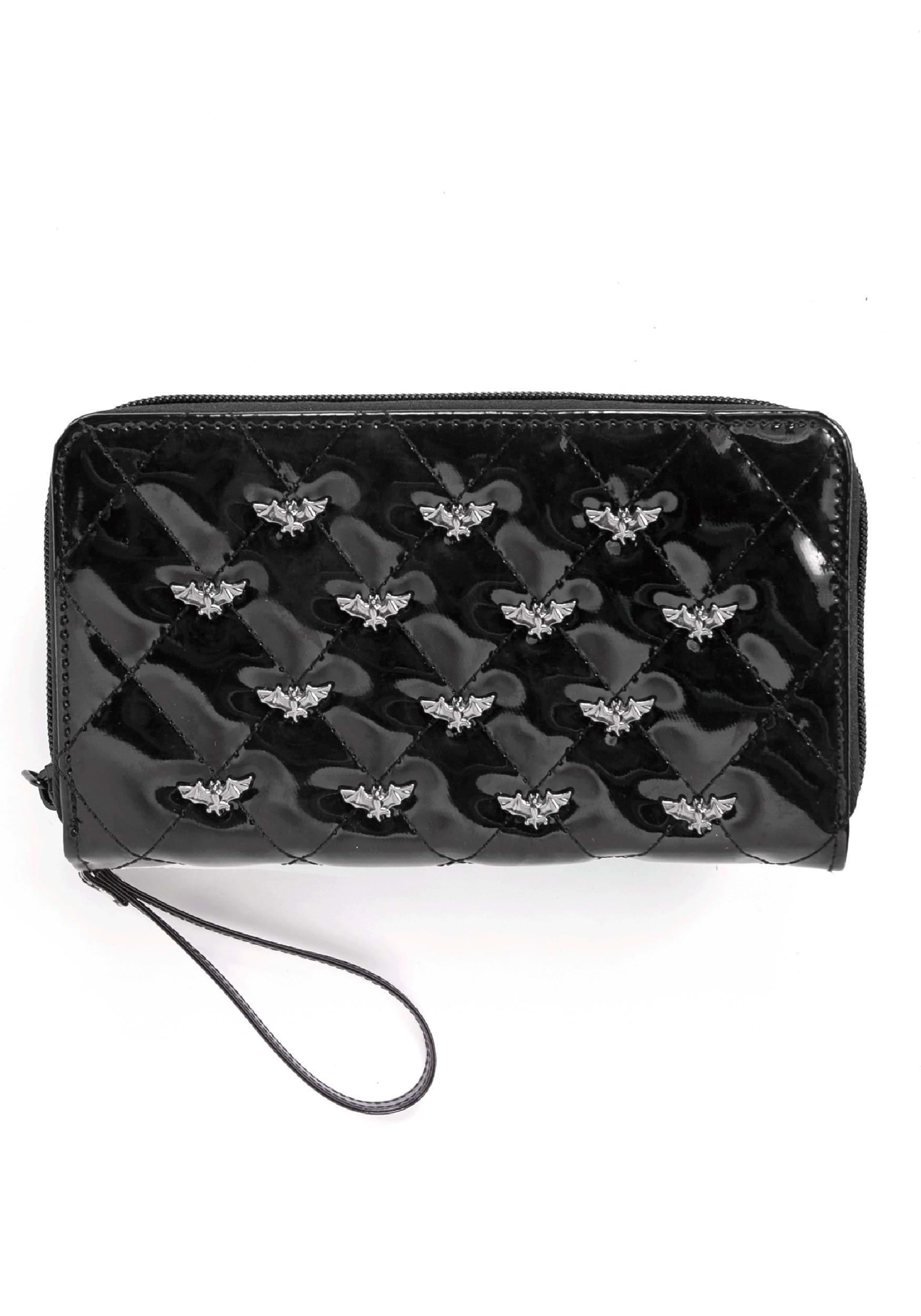 Bat Studded Quilted Faux Patent Zip-Around Black Wallet