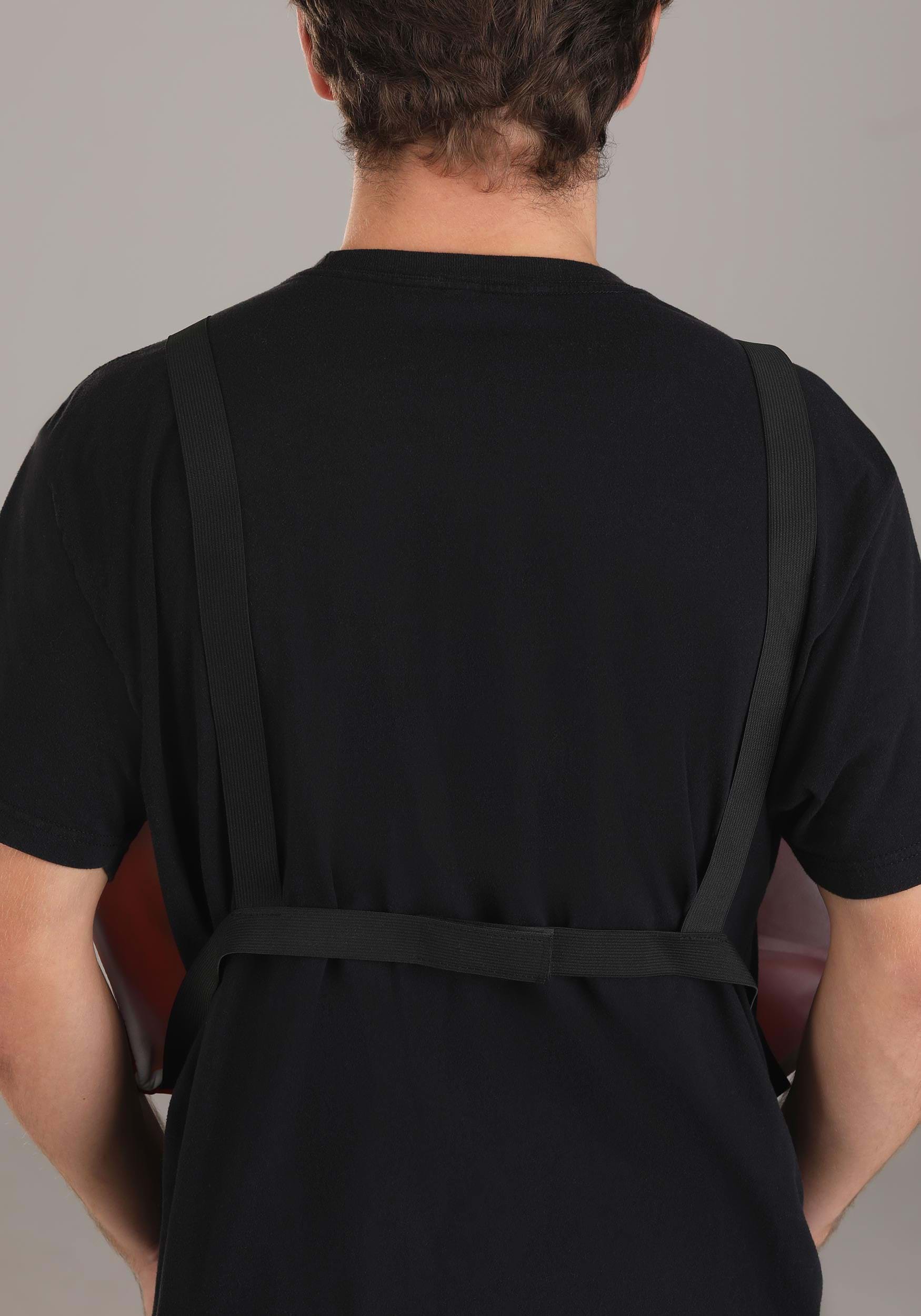 - Elastic shoulder straps and belt that closes at back with hook and loop fastener