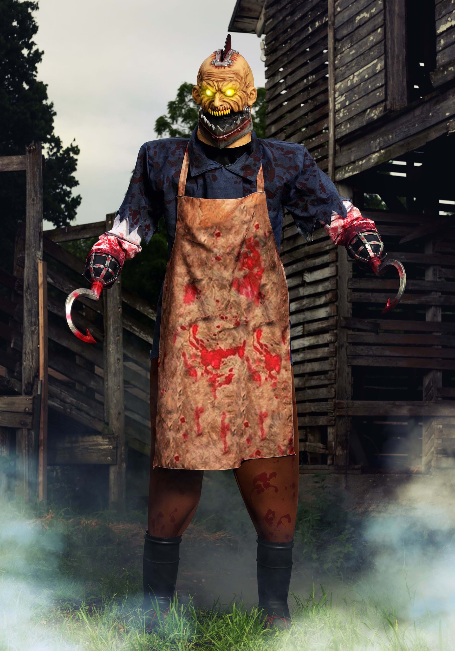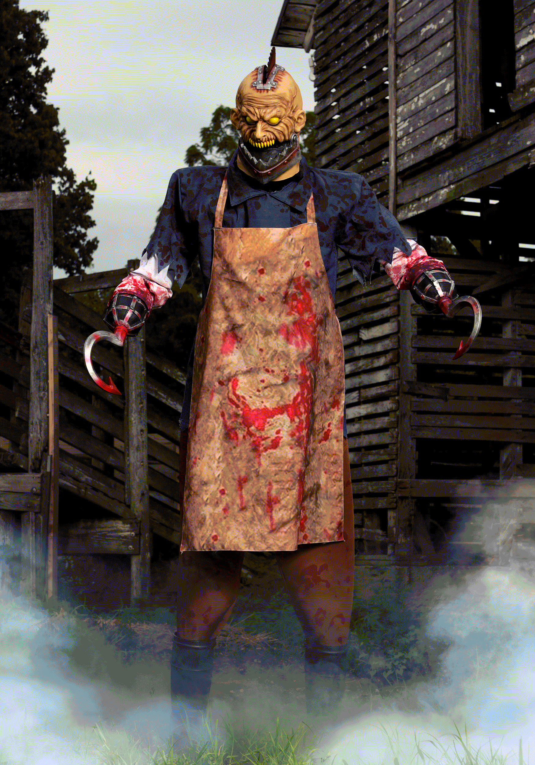 This animatronic is not for the faint of heart. From head to toe, this looks like something out of butcher shop nightmare. Buzzhead features two arms, each with a meathook in place of a hand. He's dressed in a ragged set of clothes, complete with fake blood splatters all over them. In front, Buzzhead is wearing a butcher's apron, and it looks like he just carved up something... fresh. His head has an animated saw right in the middle of the skull for an extra-frightening appearance.