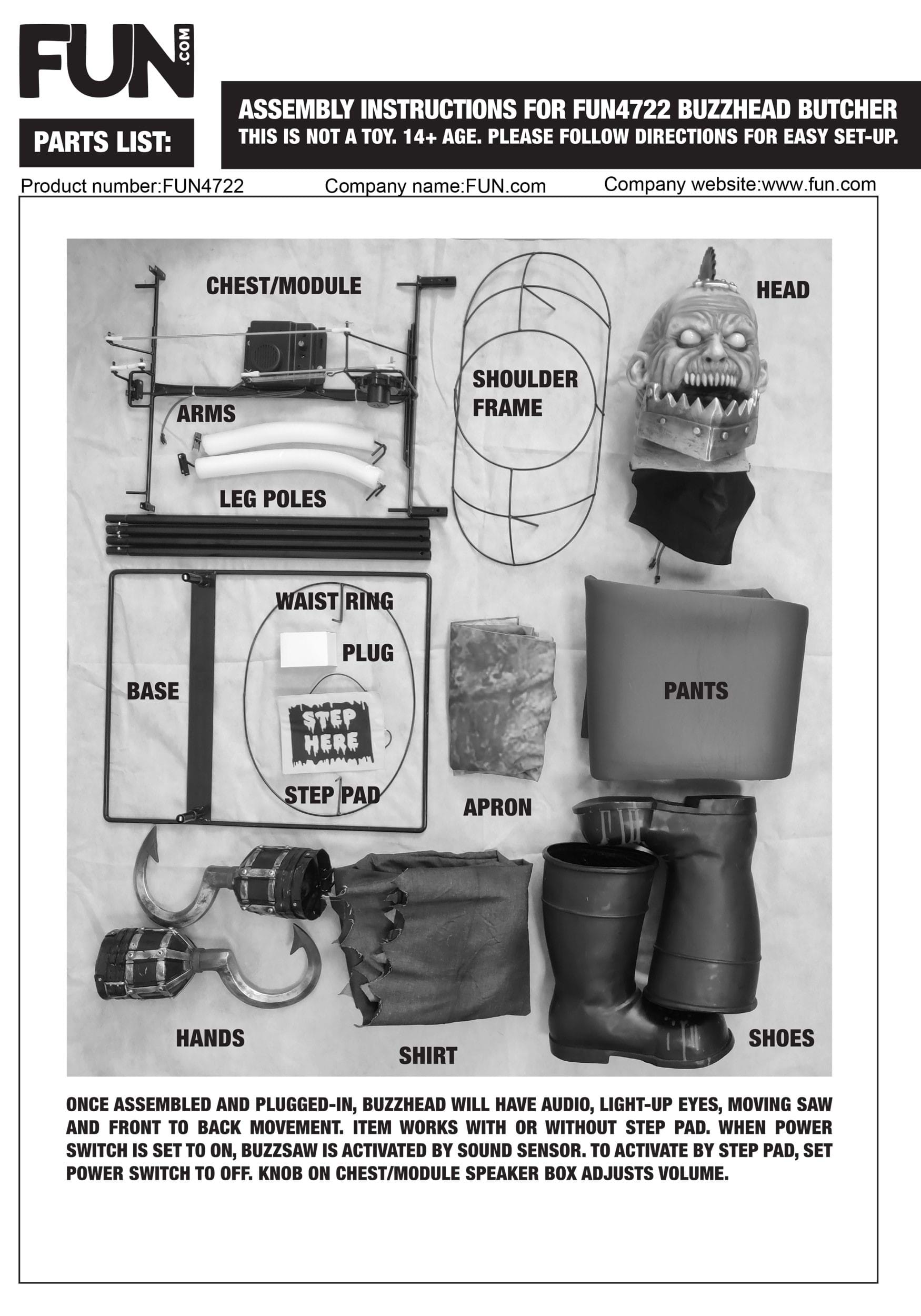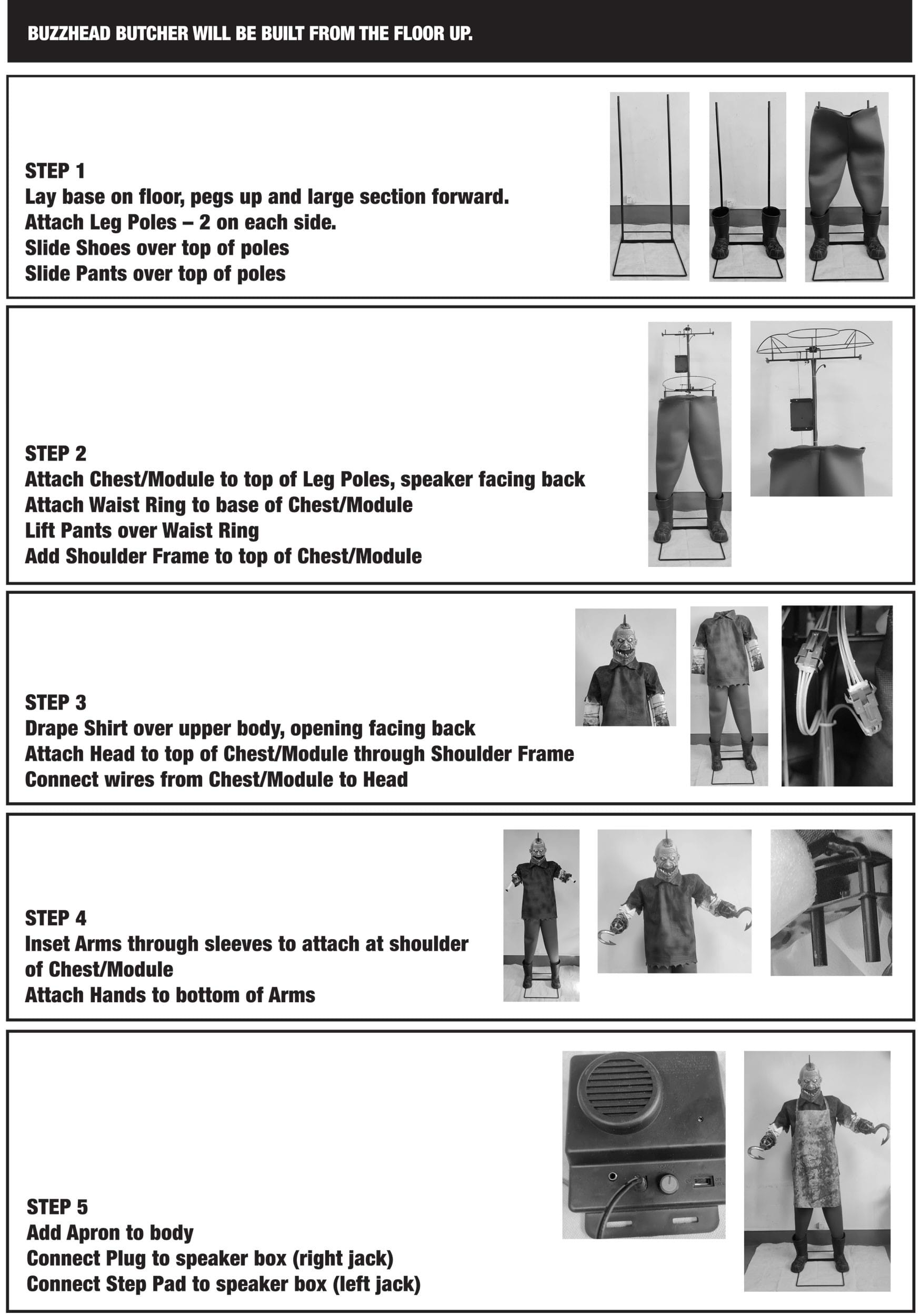 When activated, the animatronic makes 3 different bone-chilling phrases. He also moves, giving your guest a jump scare when they walk too closely to ol' Buzzhead! The animatronic is active by motion sensor, but can also be used with a step pad (not included).