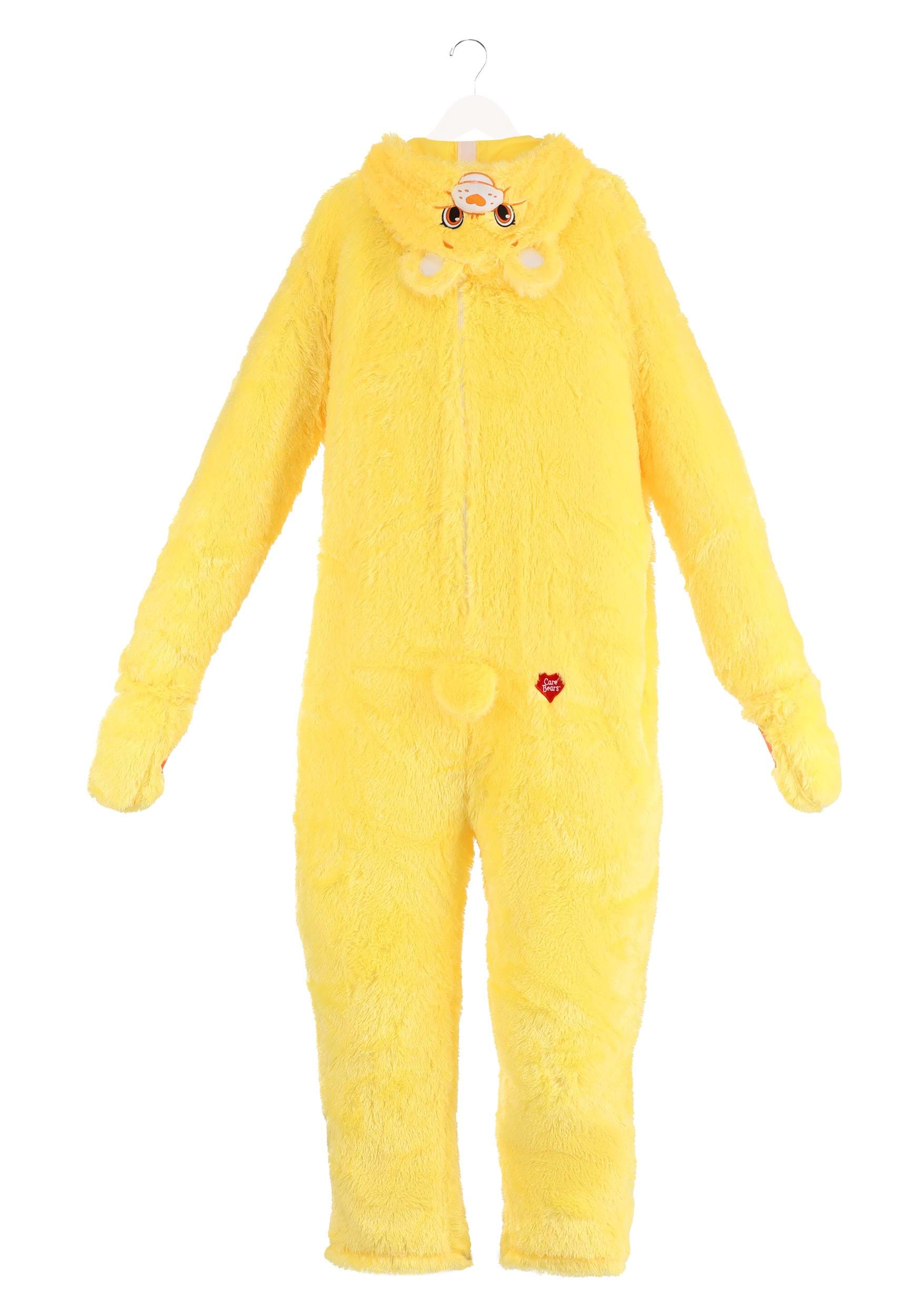 Answer the age-old question of the source of sunlight for once and for all when you wear this Classic Funshine Bear costume. This Made by Us costume is one of our favorite lines: our officially licensed Care Bear jumpsuits. This is a bright yellow suit made of custom fur that features a white belly and the embroidered smiling sun that is Funshine's Belly Badge. Attached mitts and shoe covers keep your bear aesthetic complete while the hood pulls up to reveal Funshine's smiling face and ears. (Don't worry—we remembered the heart patch on the rump!)