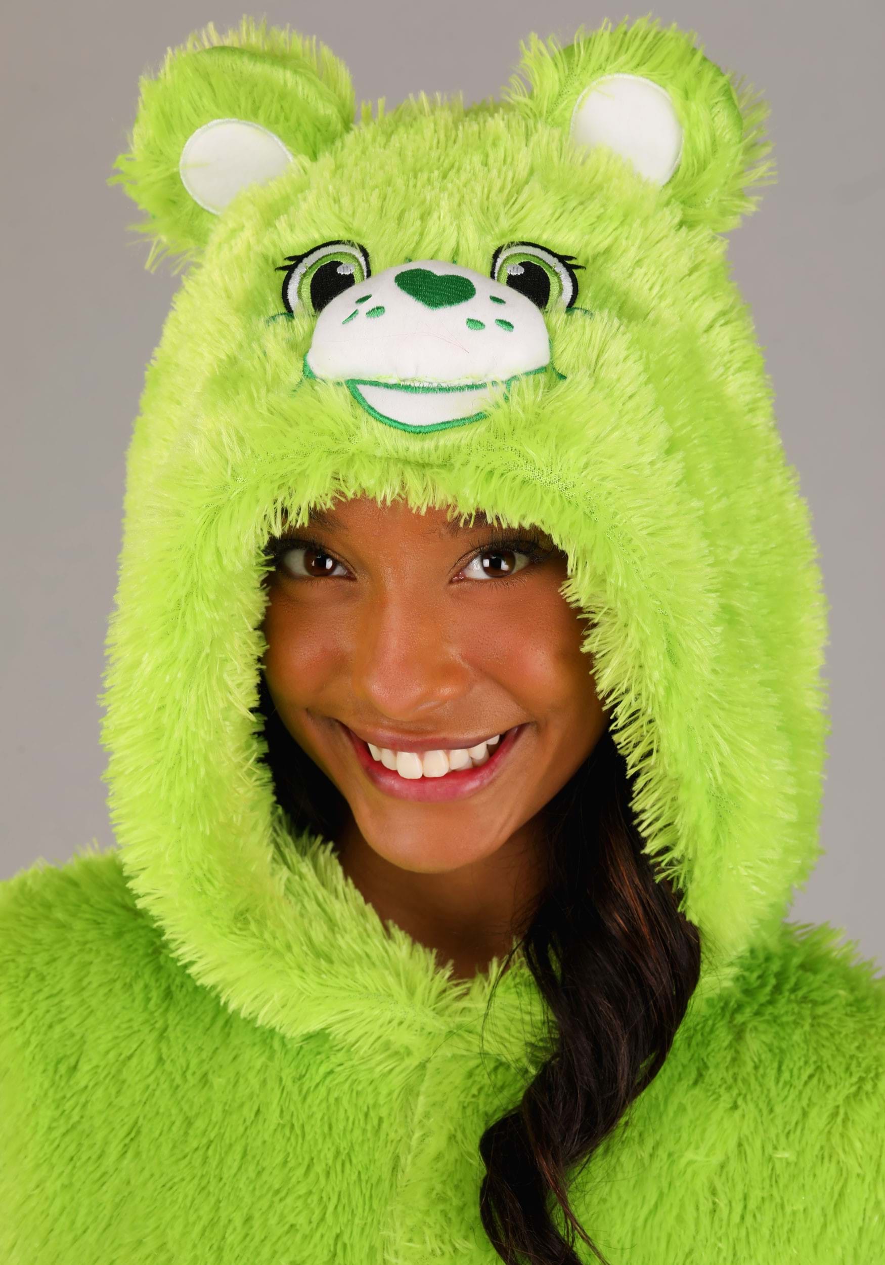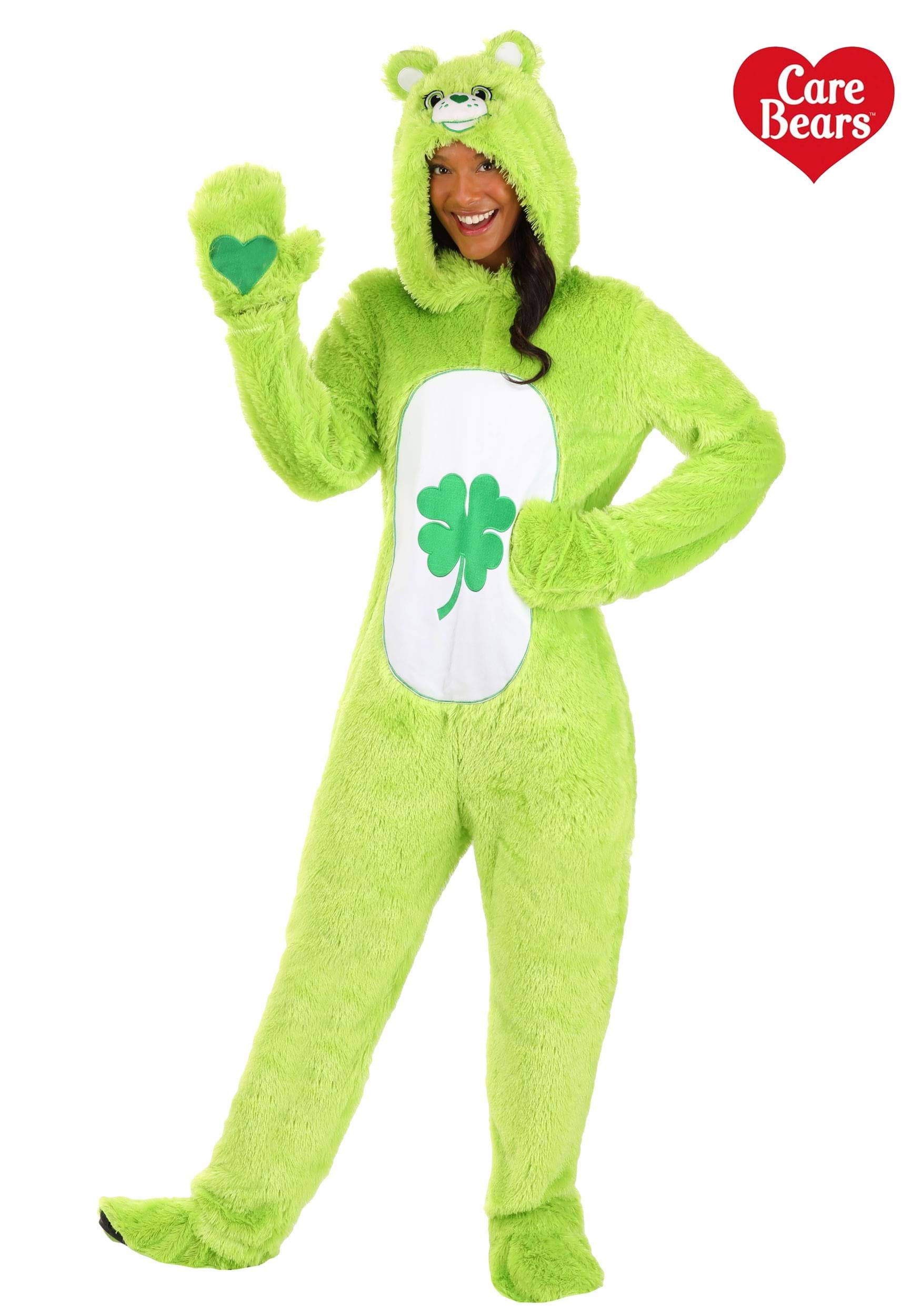 You'll get even better vibes from the Care Bears if you dress up in this cozy green bear jumpsuit. This is an officially licensed Good Luck Bear designed in our in-house studios to have you feeling just like the Care Bear. You won't need any extra luck to make good friends in this outfit; it's cheerful enough! It has an attached hood, mittens, and shoe covers. The hood has embroidered eyes, a heart nose, and sweet, fluffy ears. It has a large white four-leaf clover belly badge to let everyone know what you're all about.