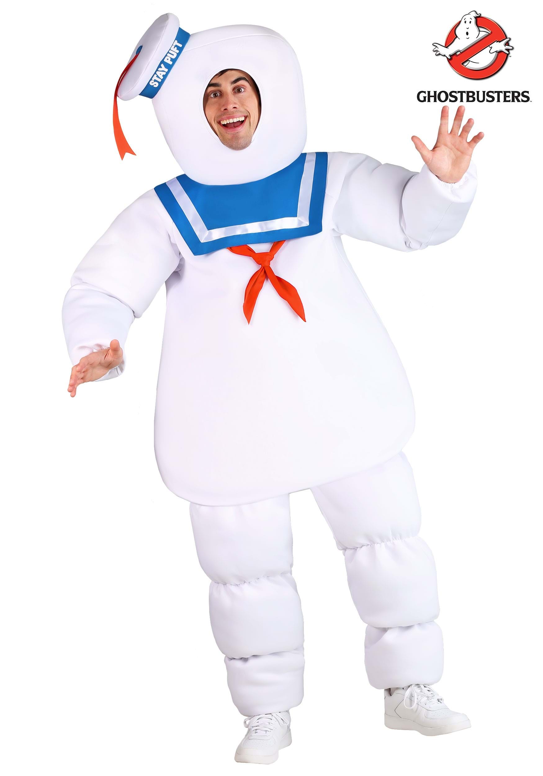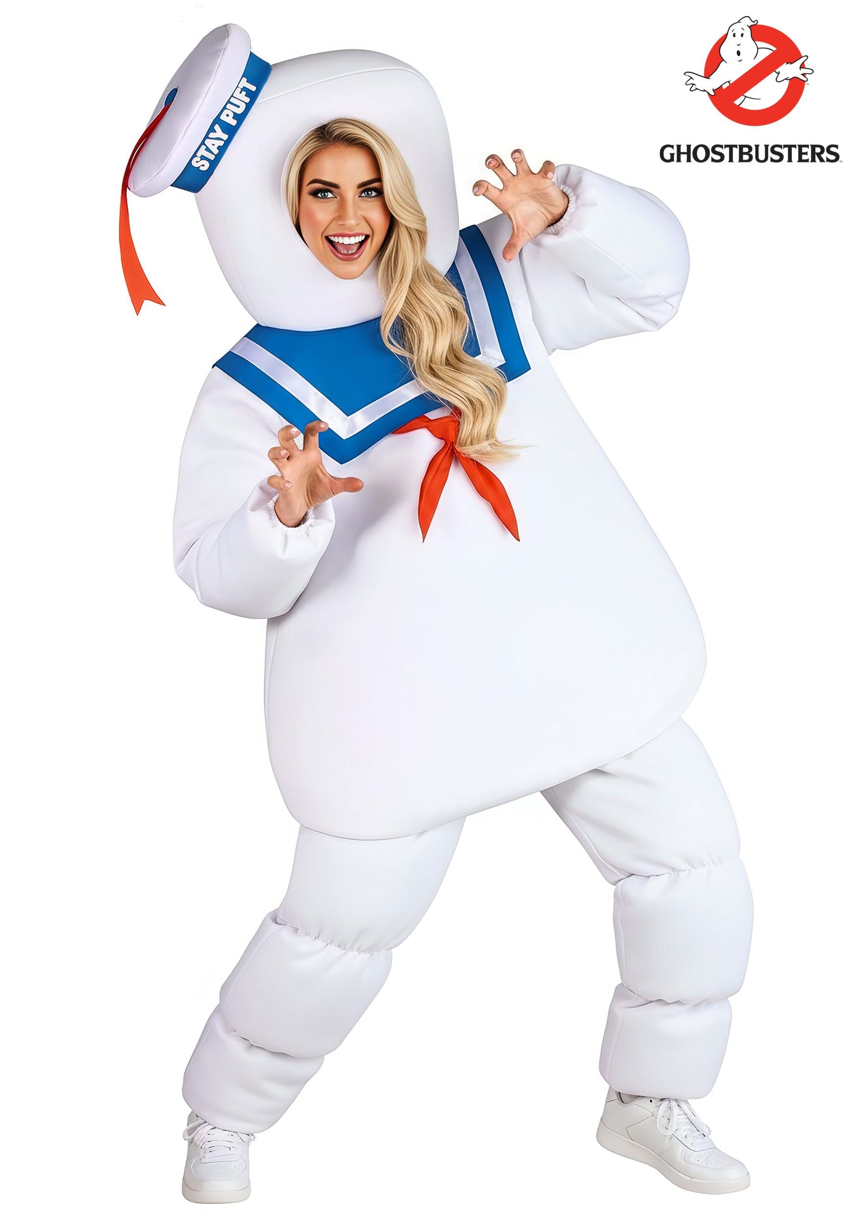 This hilarious licensed costume will make it look like you're straight out of The Ghostbuster franchise. This iconic costume has a fluffy body and puffed up sleeves and pants. A square blue collar with a red scarf sets off this white costume just right. The costume secures at the back with hook and loop fasteners. The costume is finished off with a headpiece that frames the face and it's topped off with an adorable little hat. This sweet, fluffy costume might look super cute but you know that you're a demon straight from Gozer's realm.