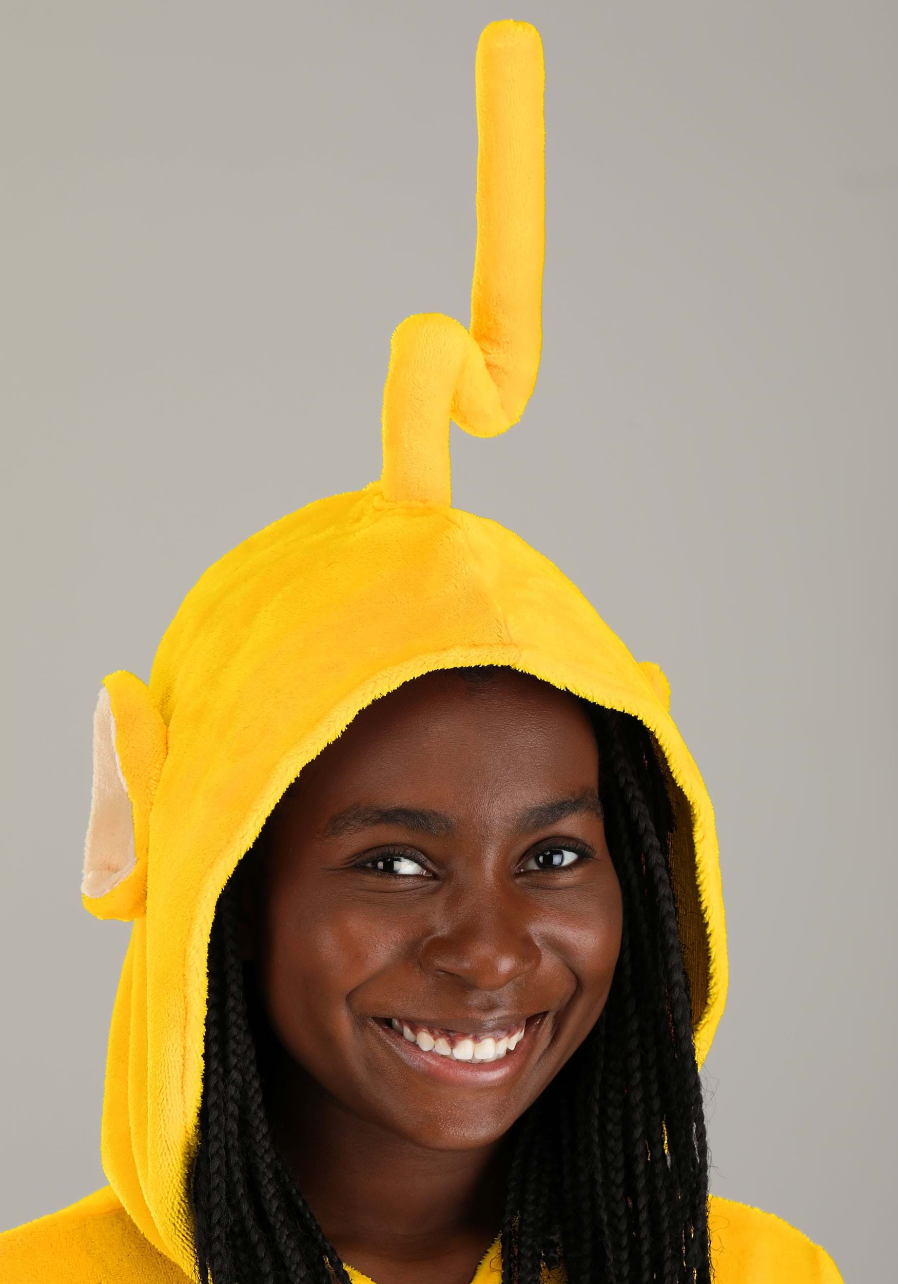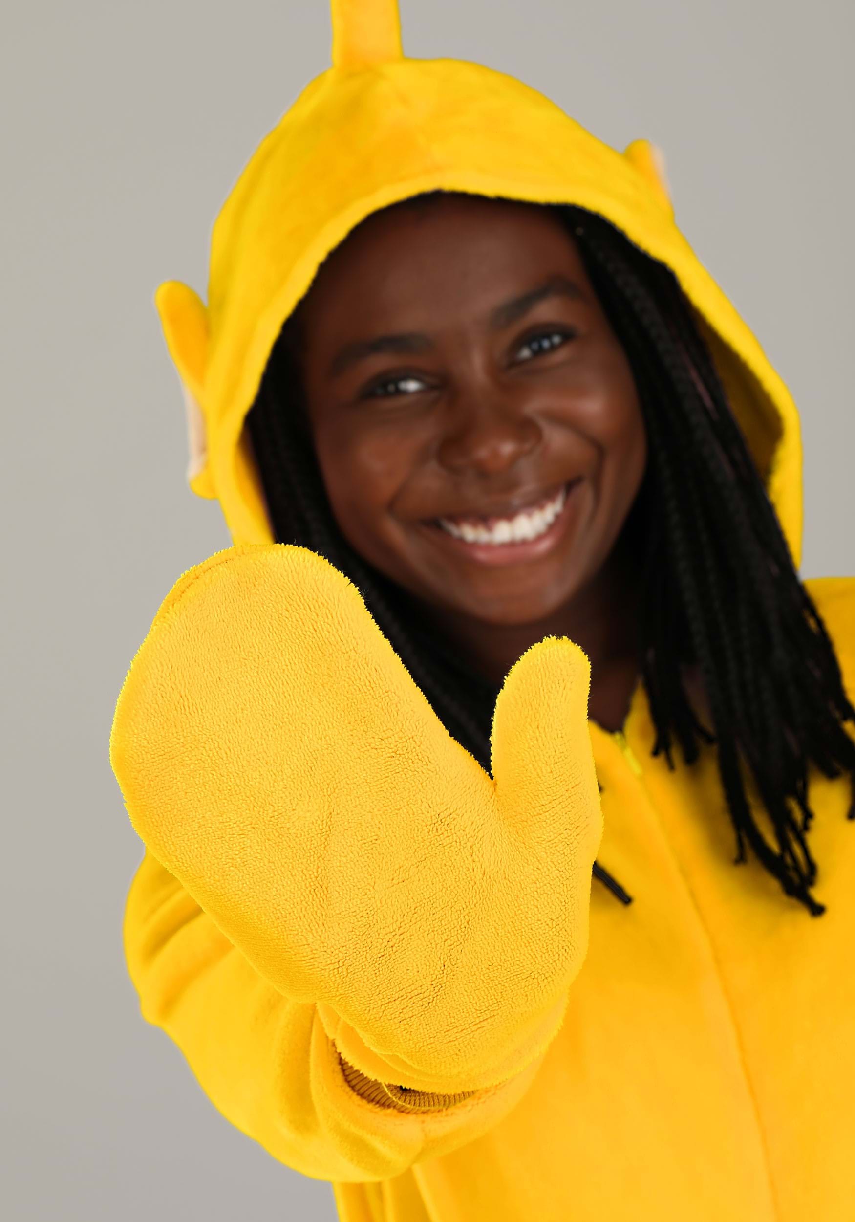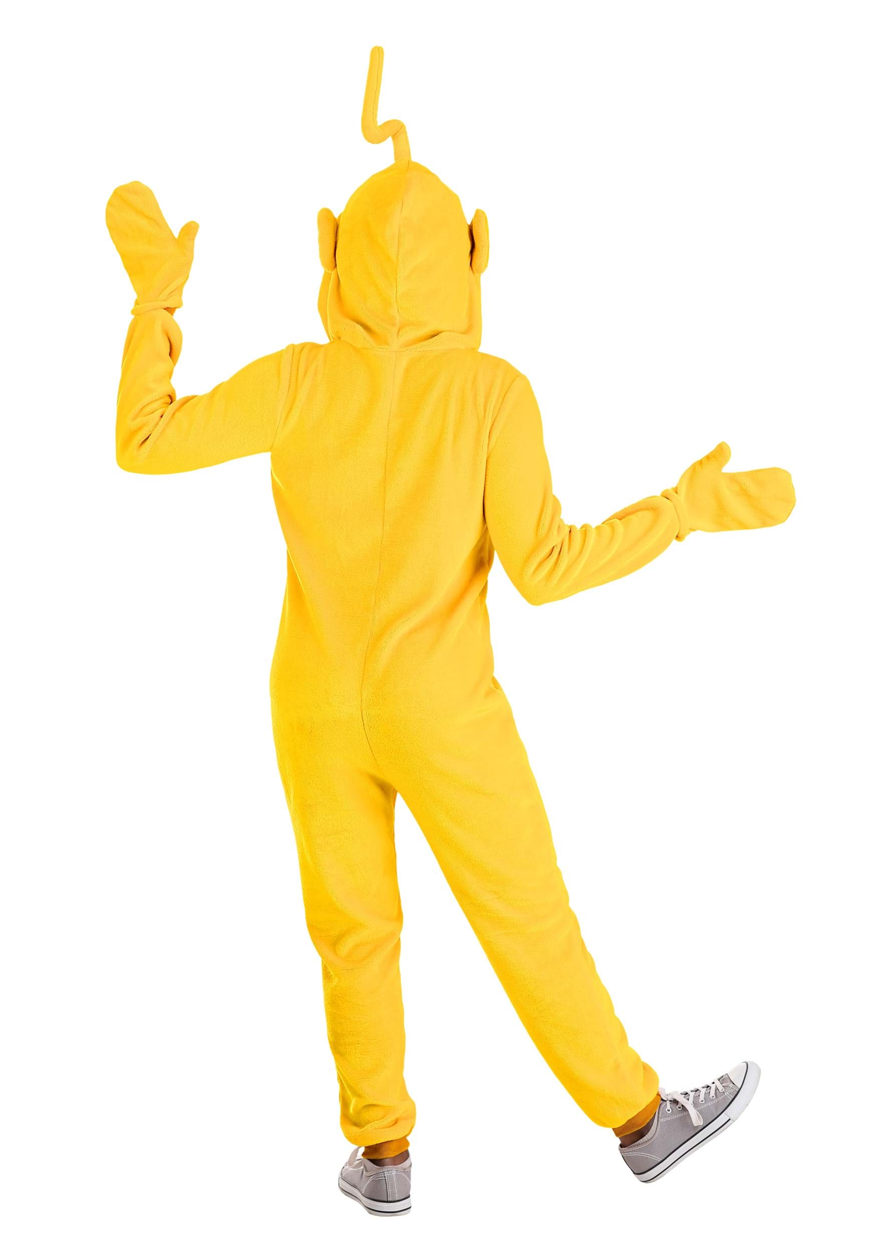 This is an exclusive Adult Teletubbies Laa-Laa Jumpsuit Costume.